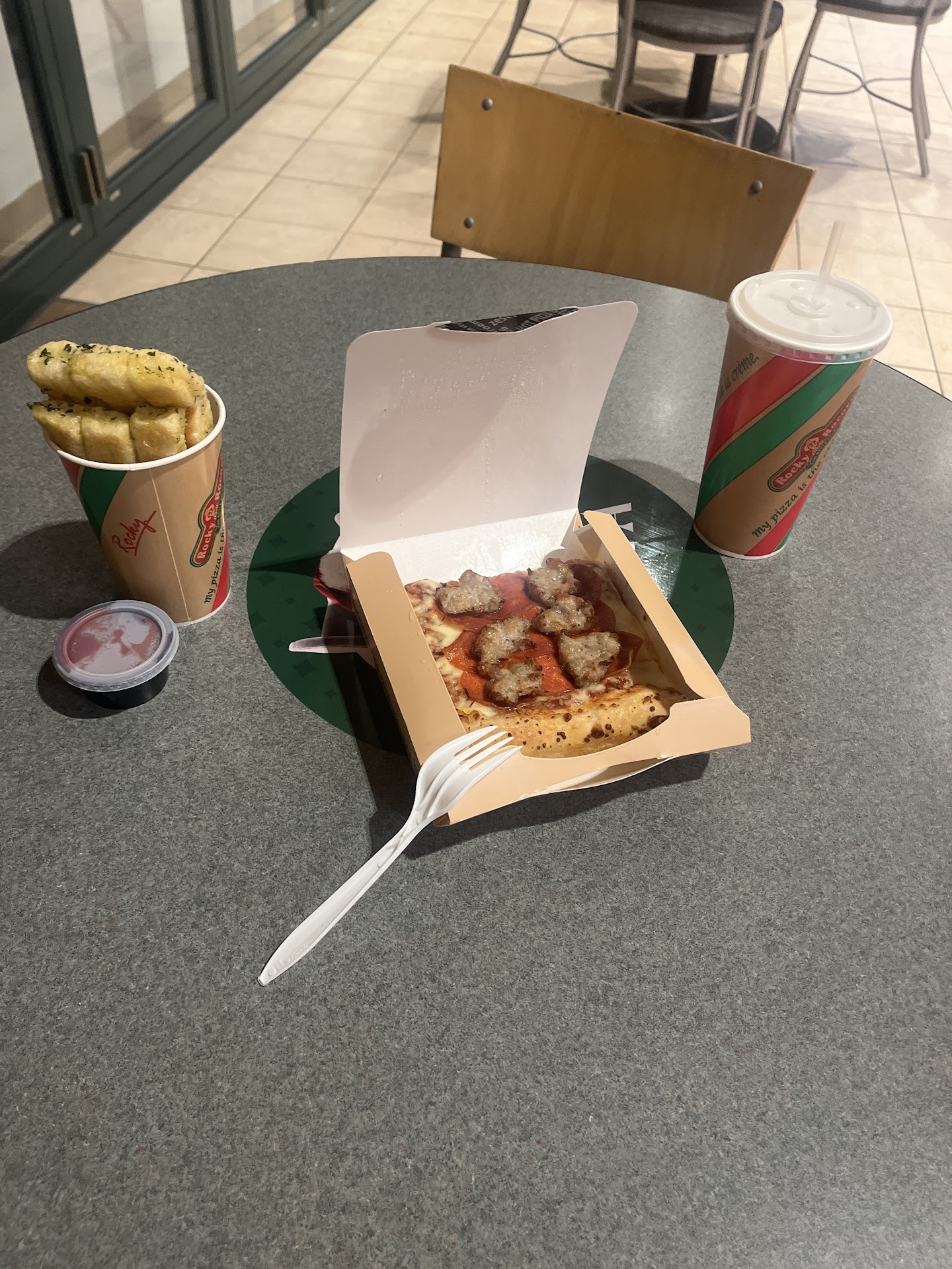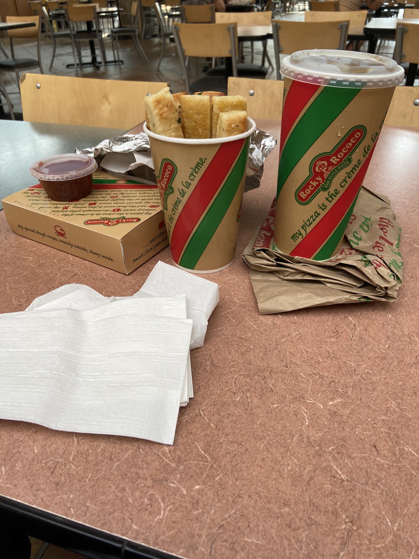 Read moreWhen I walked into the fox river mall, on a Sunday afternoon, I got a whiff of greatness coming from this corner pizza place called "Rocky Rococos." My feet left the ground as I started to levitate towards the scent and once I got to the counter I was greeted by beautiful smiles of the amazing employees. I ordered a super combo the sausage and pepperoni slice with breadsticks and a root beer and it was ever so heavenly!! I left a $50 tip because of how amazing this establishment is and how amazing the people were:) I would 110% recommend everything on the menu it's so delightful and scrum-diddly-umpcious!! P.s. super cute dude with curly hair and highlights...