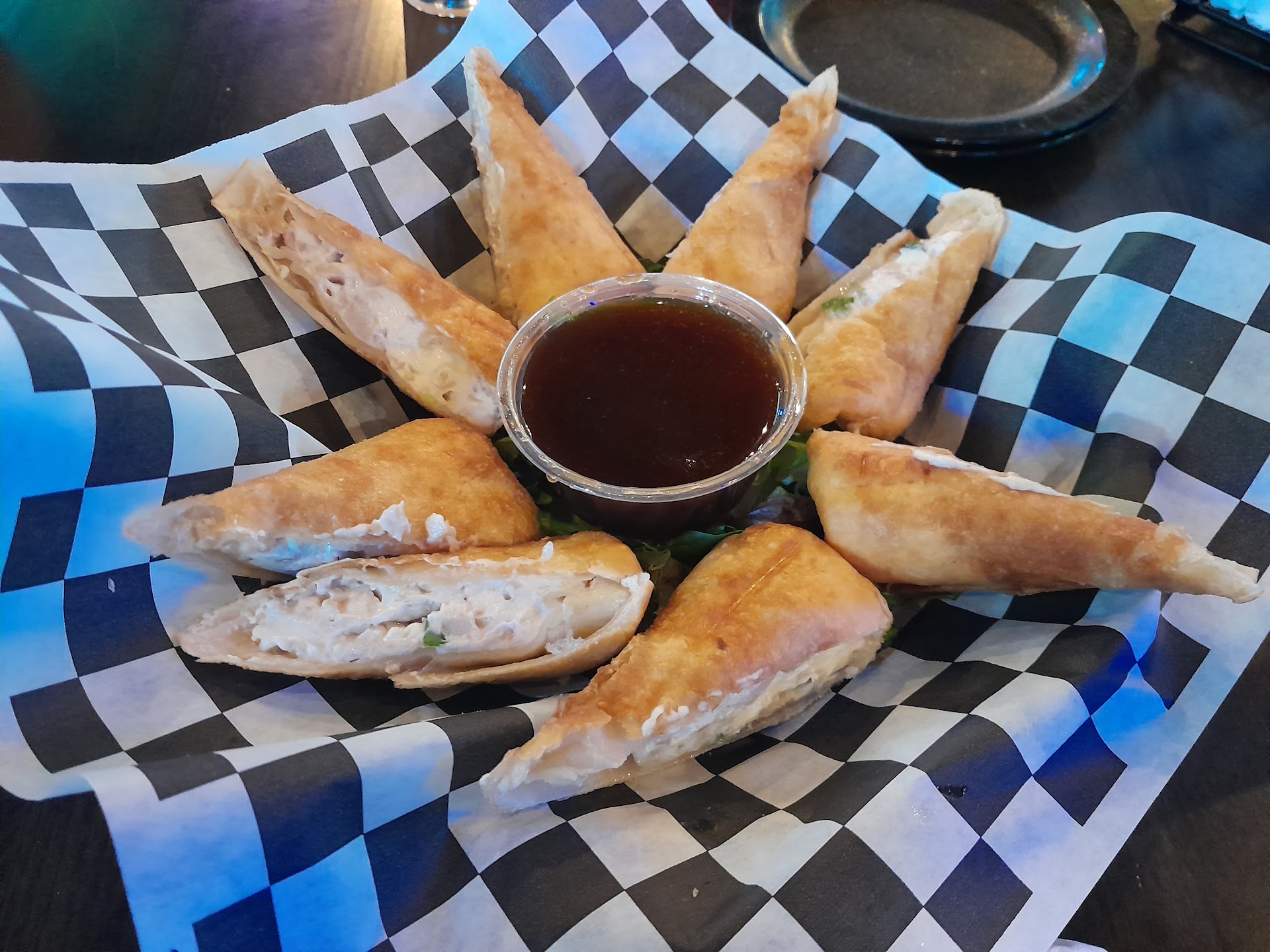 I don't remember our waitresses name but she was excellent. She was attentive and sweet and she really kept me in high spirits about the entire dining experience. We got 3 appetizers and honestly, we were in over our head because they gave us so much food. It was all delicious. We had the chips and queso, the Bavarian Pretzels and the cheese curds. The cheese curds came with chips and onion dip and the onion dip was so good. My boyfriend mainly ate the cheese curds but he said those were good too. The chips and queso were really exceptional. The queso was seasoned really well but it could've been a little spicier and it would've hit it out the park. The Pretzels were great but when aren't Pretzels really good. The cheese it came with was really unique. I wasn't a huge fan of it with the Pretzels but it was still extremely good. I got chicken tenders and my boyfriend got the spicy garlic tacos. I got a little piece of the taco and it was fire so I know a whole one was insanely good. My chicken tenders were ginormous and it was a little off-putting and made me not want to eat them. Plus we already had so much food with the apps that it made no sense for me to eat them. The fries and onion rings were good and the honey Mustard they have as a sauce was amazing...