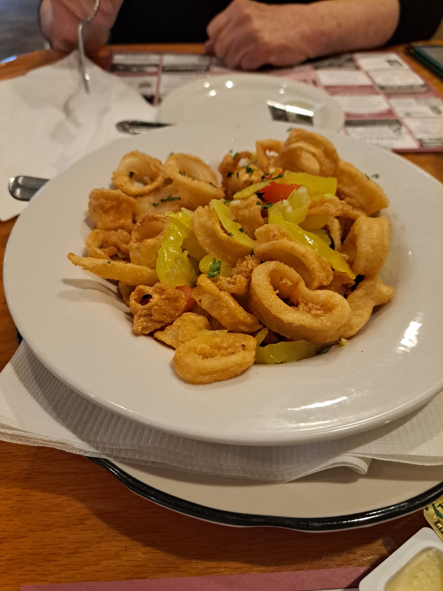 An appetizer I cannot recommend enough is calamari Capri. They are served in a wine butter garlic pepper sauce, along with banana peppers and black olives. The calamari Capri is probably the best calamari I've ever had, and my family get it every single time we come.