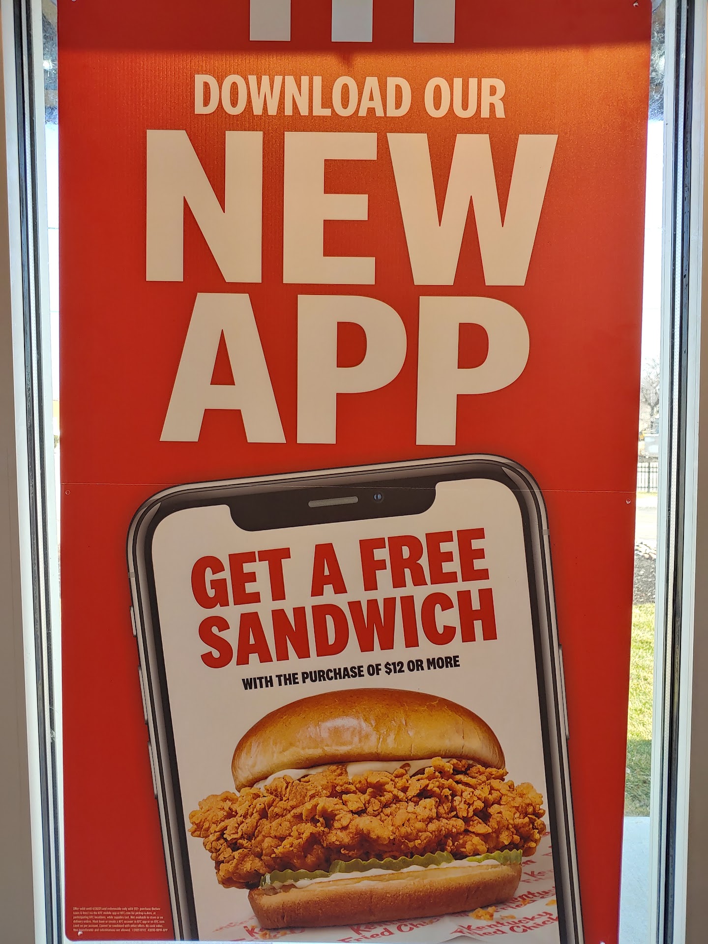 Ā Ā Ā Read moreI can honestly say that it was the WORST CHICKEN EVER IN MY 43 YEARS LIFE!!!! Even the biscuit tasted like it was a week old. One chicken leg was so dry that it was like eating tree bark. The other leg and thigh were soaking wet. I have NEVER had chicken that was that wet! I'm not sure if it was grease or water. All of it was cold! I tried the wings for the first time. The wing meat was even soaking wet! The biscuit was hard as a rock! I have no idea why everything was SO HORRIBLE?!?! To add insult to injury, there is a sign that simply says that you get a free sandwich if you download their app and spend $12 or more. It doesn't say anything about having to order on the app! I am right now trying to decide if throwing up is enough, or if I should go to the ER due to their food. Don't go here, your health and life may...