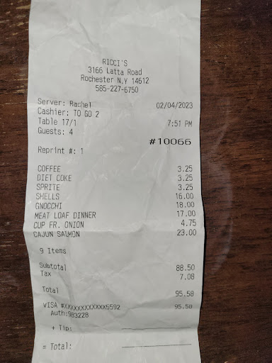 Read moreUnfortunately this review is not going to a nice one, we have been patrons of Ricci's for over 20 years, we live nearby and have brought many of our friends and family there. We supported them during the pandemic by ordering out frequently. Long story short, went there Saturday night, they seated a couple at the table next to us, they had attitude right from the start, a friend of ours was standing by our table, chatting, as she walked back to her table she said "to bad we couldn't have gotten the table next to you". The man sitting at that table immediately started yelling at her, being very rude and nasty. My husband asked him to stop and calm down at which point the man started yelling at my husband, after a few minutes of trading insults the man jumped up and started going towards my husband as if he was going to get physical, at this point the wait staff and the owner got involved, the owner pointed her finger in my husband's face and very nastily said" not another word from you!" The staff was being so nice to the man that started the whole thing and giving our table dirty looks, they moved the guy to another table and for the rest of the meal we were being stared at like we were evil. Obviously the other couple knew the owner and wait staff so we were the bad guys. We won't be going there anymore. Just to be clear, the guy was a vet, missing a leg, he managed to get that into the argument, probably in his 40's. My husband is 66, and always respectful...