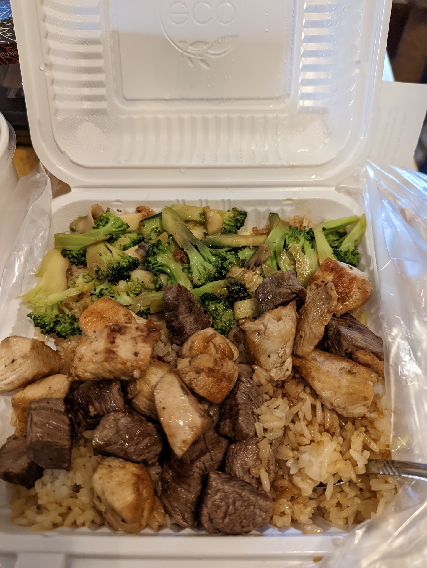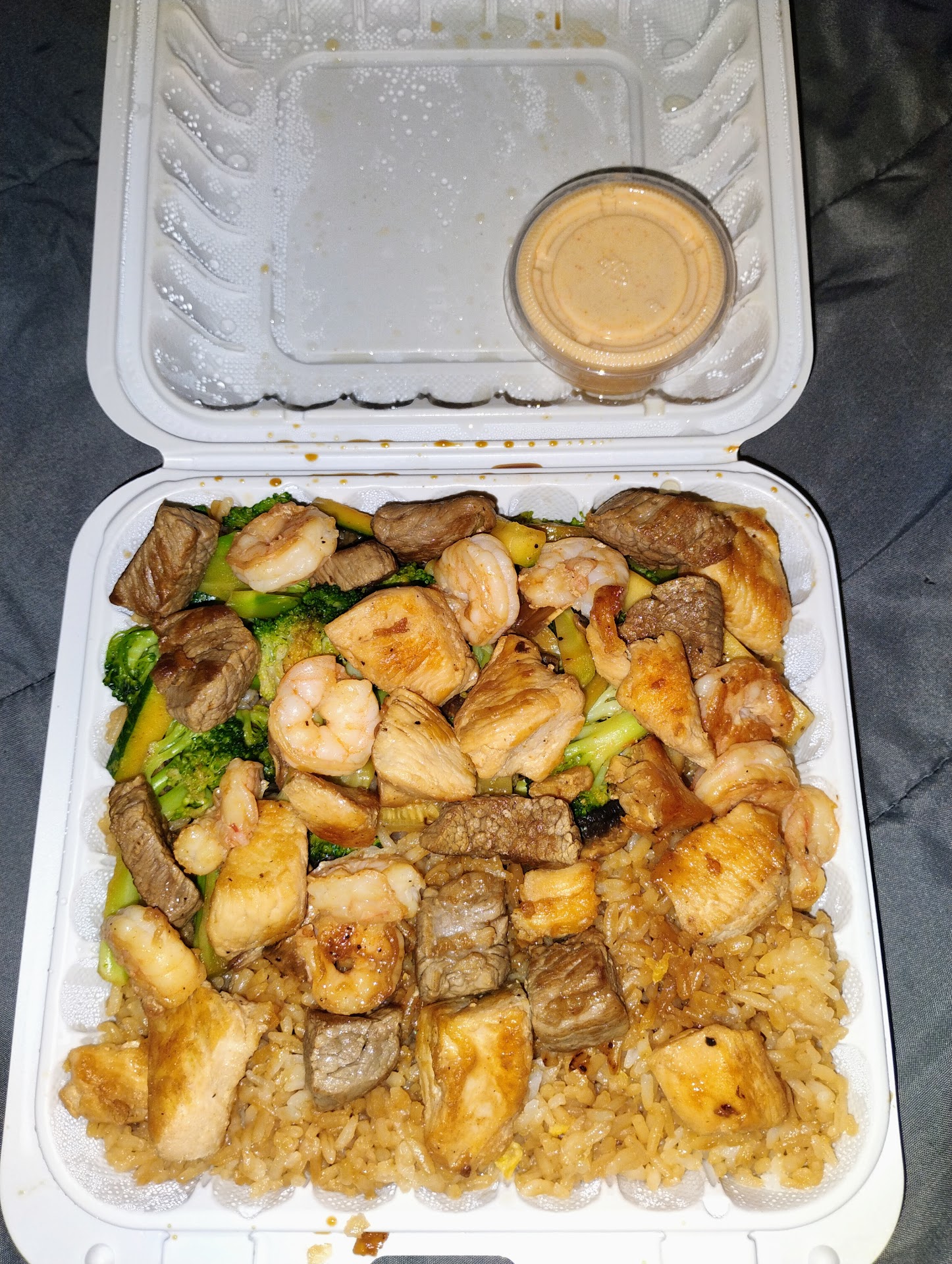 I’ve seen the signs for this place hundreds of times but for some reason have never thought to try it. Well boy I’ve been missing out! Was riding my bike past tonight and glanced into the restaurant, and something about the place seemed inviting. I thought to myself, maybe I’ll go in and glance at the menu, and as I walked towards the door I saw they had menus right outside! After glancing over the menu and seeing the affordable prices and all the choices they had to offer, I thought it might be too good to be true. I decided to give it a shot though. As soon as I walked in I was greeted by the friendliest woman and immediately felt comfortable. She was quick to answer the questions I had, and even read my mind and mentioned that I could substitute fried rice with noodles! So I placed my order and she informed me it would only be 5-10 minutes before it was ready! I sat down for a minute then decided to step outside for a cigarette. Before I was even done smoking, here comes the same friendly woman bringing my food outside to me! She asked me how many forks I needed, and even explained what the extra sauce in the bag was! At this point I thought it was definetly too good to be true. No way would this be authentic hibachi. But as soon as I got home and opened my food container my mouth started watering. The food was absolutely perfect and delicious! I couldn’t have been more satisfied! The steak was tender. The shrimp and scallops were cooked just right, and the noodles and vegetables were perfect as well. On a scale of 1-10, I’d rate my experience a 100! From the service, to the quality of the food. I can’t believe I never stopped here before! This will honestly probably be the only place I go to for take out for...