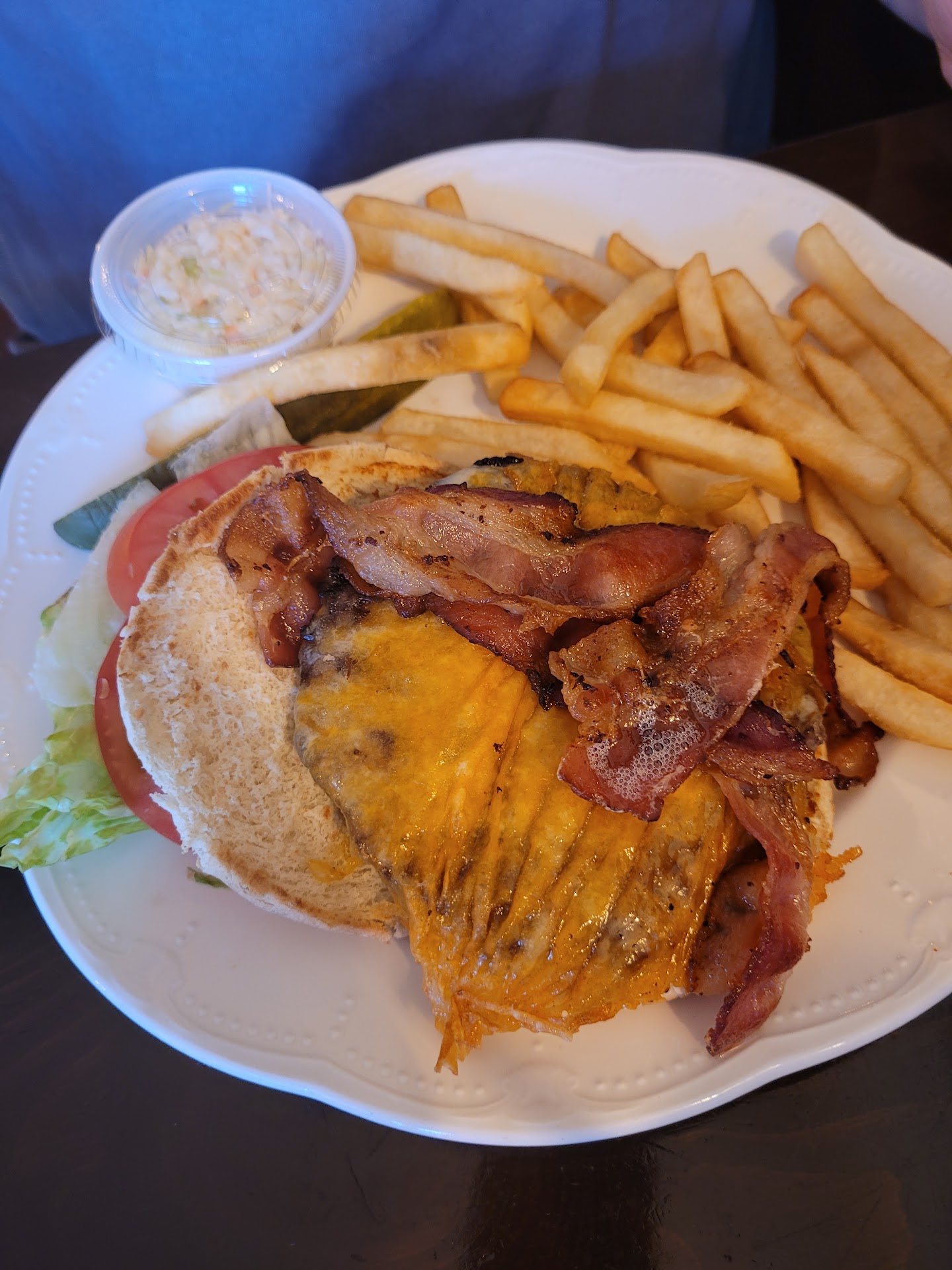 Read moreThis little gem was an amazing find. Very clean and so much character with all the original art pieces on the wall that are for sale. Loved that! We placed our order, and I said I'll be able to judge just by the iced tea that I ordered if the food would be good. Well, I was not disappointed. The tea was bold and refreshing, not watered down at all. Then the food came from a server who was so friendly. The food did not disappoint either. Got my burger, which was done to perfection. That burger was stacked! The sauce on the side is delicious, especially with the onion rings. We will definitely be returning to this gem very soon because I just know that everything on the menu will be...