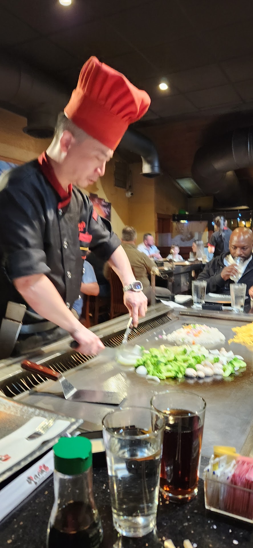 The service was great, and the theater of all of the fire making and spatula tossing can be quite fun. My problem was that there was a very large group of what looked like late teens or early college aged individuals on a table behind us. And literally they screamed every 2 minutes. They screamed when there was fire, they screamed when their zucchini pieces were tossed at them, etc., so it was really, really loud. We were in the room with a very high ceiling, so I'm sure that made it worse. If you make a reservation you can ask for a seat on the quiet, bar side. It was clear that it was a lot quieter there.