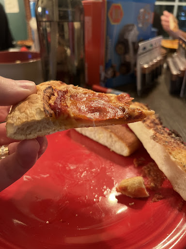 A statement printed on their carryout box suggests you go for the corners. They definitely have it right there. You are more likely to encounter the cheese caramelization and some crispness to the dough at the corners. There is no crispiness to the bottom dough as you approach the center. In fact, my wife thought the dough at the center of the pizza was undercooked. It certainly had not risen like the edges. The toppings totally compressed the dough in the center. That cheese stick dough had risen nicely in the center of its pan, too bad the Detroit Style dough didn’t.