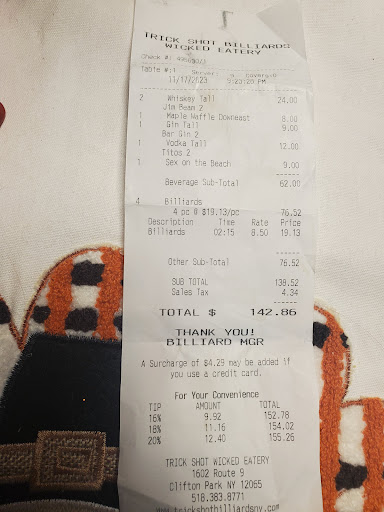Read moreNot happy at all with Trick Shot pool hall in Clifton Park. We went last night for a night out with friends. Played pool for a little over 2 hours and got a couple drinks (4 amongst the 4 of us - 2 whiskey sours, 1 sex on the beach, and a hard cider). Well it was super busy and crowded and dark by the counter when we went to leave around 9:30 so we didn't really take the time to scrutinize the bill we were given and just paid quickly to get out of the way and free up the table as there were no open tables left at that point. Today I was talking about how pricy it was so we took another look at the receipt and we were charged for 2 drinks that we didn't order that cost an extra $21 between the two of them. There were 6 drinks listed total, including a tall gin ($9) and tall vodka ($12). I called today to explain the error and try to get it rectified and was told by a guy named Josh that basically tough luck, that thats why they provide the bill before you pay. After expressing how ridiculous that was, the guy said that there wasn't any real way to prove we didn't get them. I said they should ask the girl at the counter who put in our drink orders and served them to us but of course she conveniently only works Friday evenings and won't even be there next Friday so by the time she's next in, she of course will not remember us. The guy finally said that MAYBE he could give us a partial credit 'or something' if we came back in like the next week but why would I want to come back and spend MORE money at a place that ripped us off in the first place? His reason for why we couldn't be refunded was that "someone had to pay for the drinks". Umm yeah, whoevers drinks they actually were, or the girl who made the mistake and put them on our bill! Not us who didn't order or receive those particular drinks. So if you're going to go, make sure to fully analyze your bill before paying. Not sure I want to patronize a place again that offered such poor...