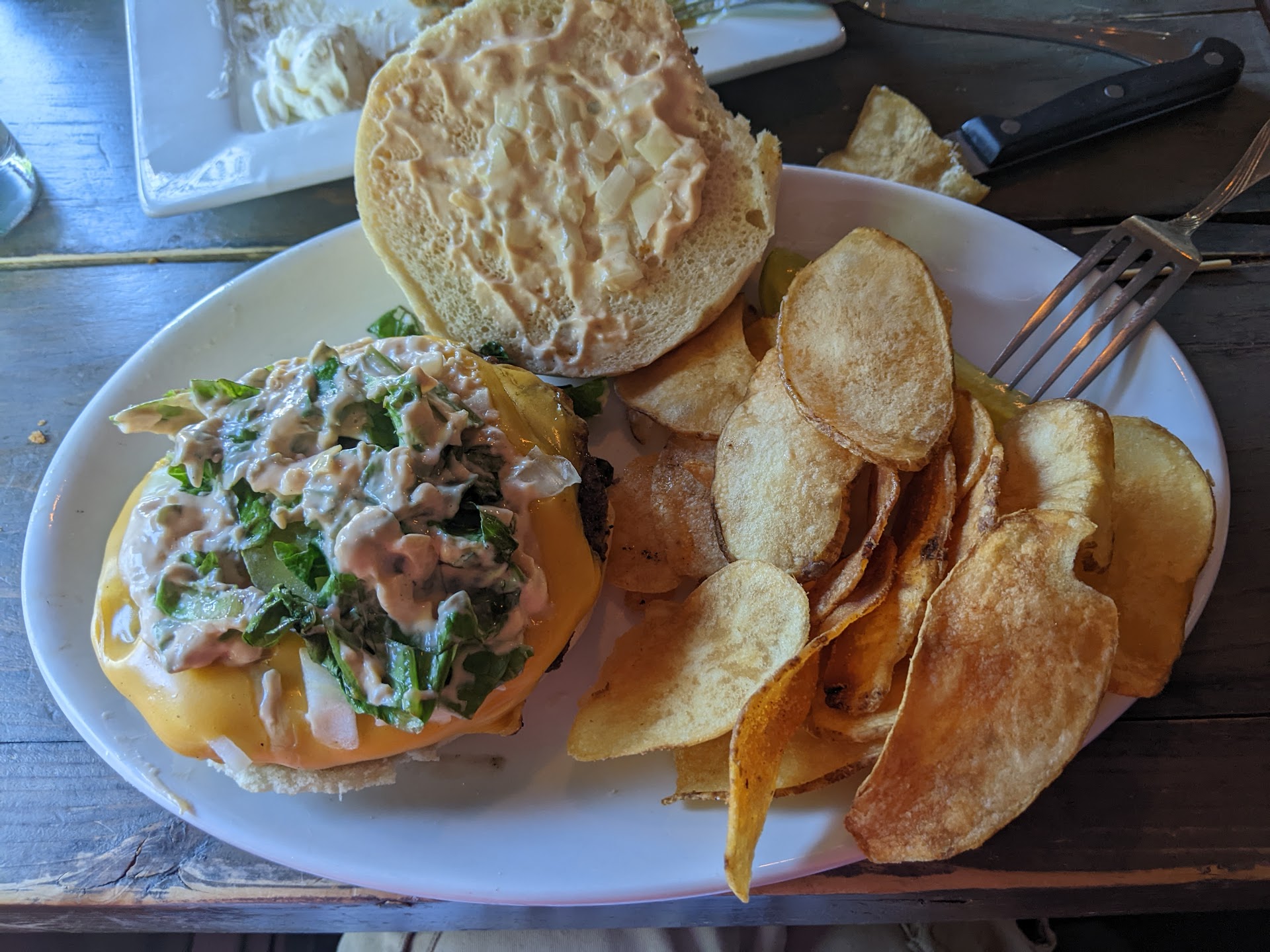Read moreThe deviled egg appetizer was good, but nothing to write home about...the brussel sprout appetizer was okay but quite greasy... The tzatziki pita appetizer was okay, nothing to write home about, the pita was warm and soft, the tzatziki was....meh. The brussel sprouts were browned and the pork belly was not too fatty but we wouldn't order either again. The burger was decent ,quite charred. the french fries are frozen, not fresh..the fish fry was so soft, great texture, not slimy at all, the batter was extremely airy, light and crisp, very great piece of fish, unfortunately the tartar sauce was rather bland and the only distinguishable flavor of it was salt. . my friend said the tomahawk pork chop with vegetables was fantastic also. The carrot cake was homemade, really great and something we would definitely order again. The cream cheese frosting was so good and the texture was nice and dense, not whipped. Coleslaw was not great, with a vinegary flavor according to my friend.We had dinner on a Wednesday and all of the food came out pretty quickly and the service was great. The restaurant is quite small and cramped. The parking lot for the restaurant is super tiny so if you go on a weekend plan on trying to find parking...