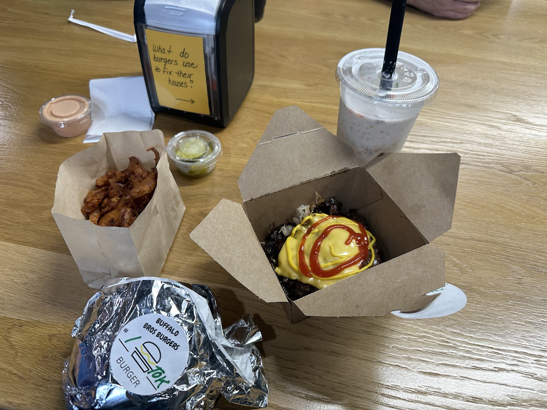 Read moreWe were finally able to stop by the newly opened Burger Bros brick and mortar location. Great news since the last few times we tried to get food from them their food trucks had just sold out. It seems their new shop is doing great and we were happy we came. We ordered burgers, Oklahoma style, a fruity pebbles shake and bro-onions which are crispy onion rings made like a blooming onion. Everything was perfect and delicious. Burgers are smash burger style, thin and crispy, the Oklahoma is some thinly sliced onions cooked in the burger. Not overwhelming onion flavor but just the right amount. The burger also had sweet pickles which were a nice touch and not too sweet. The fruity pebbles shake had just enough flavor and was reminiscent of cereal and milk. The key here was they found the perfect consistency and the right straw shape so you could enjoy the right amount immediately.