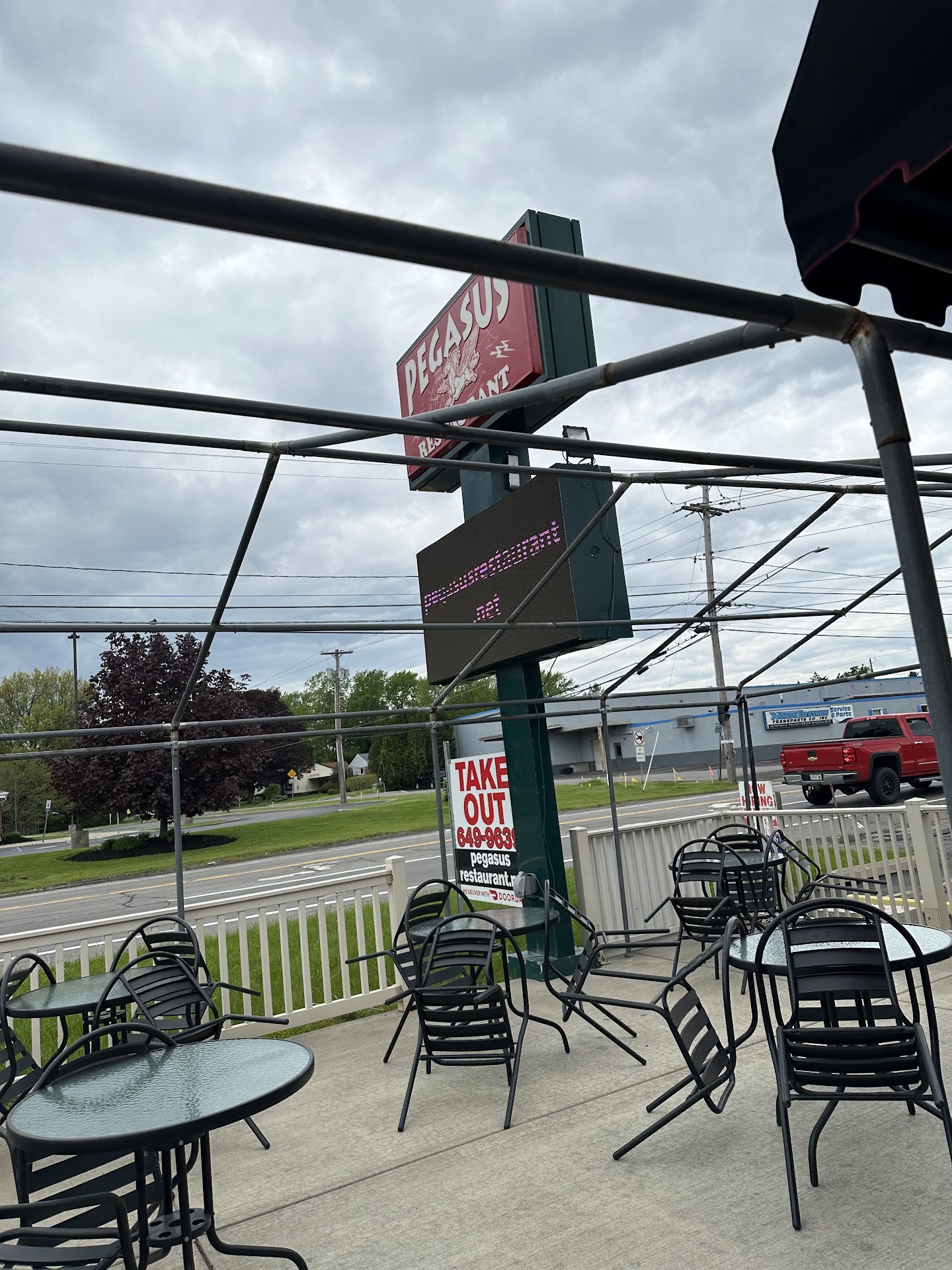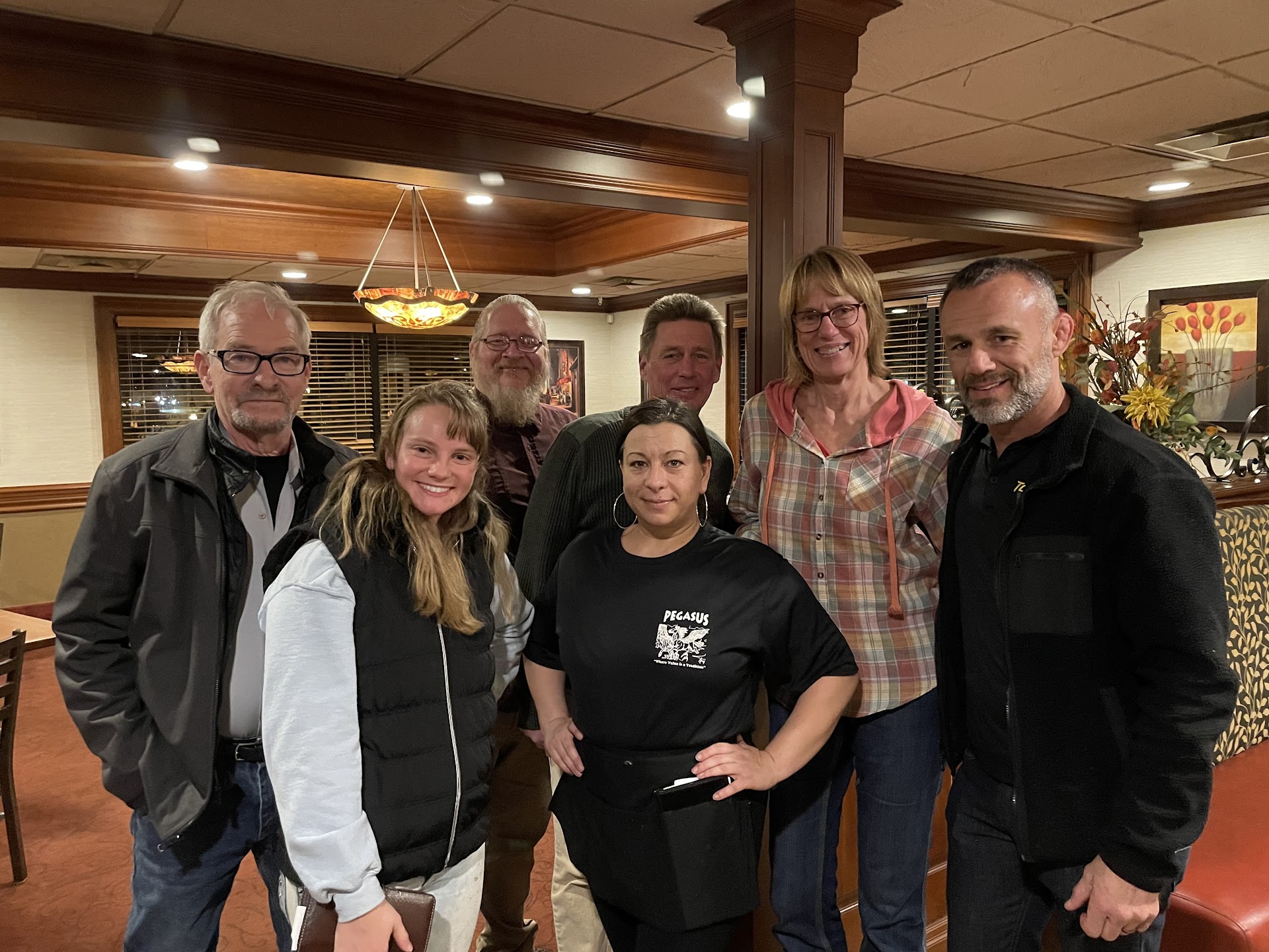 There are positive things to say about our visit to the Pegasus restaurant. The décor and atmosphere was very pleasant for two families of 4 to get together. They had no problem seating our party of eight, which was nice. The price was reasonable for today's economy, and I think for 8 people a bill of around $100 was not bad at all. Our waitress, Sky, was very nice and helpful, attentive without being overbearing.