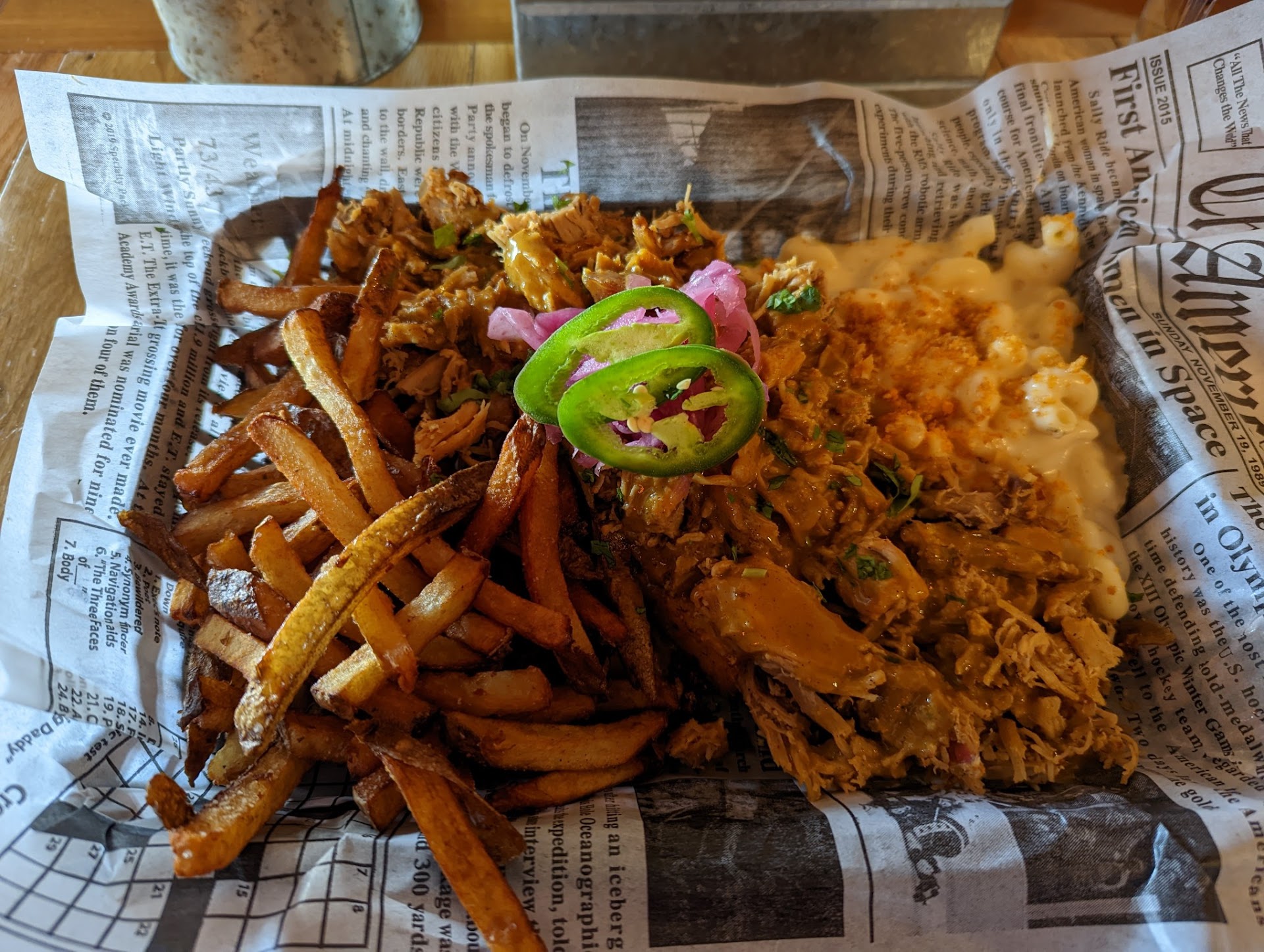 Since many calories needed to be replenished, I opted for the Pulled Pork Plate ($23), which featured pulled pork, bbq sauce, a jalapeno-cheddar corn cake and two sides. I went with the fries and mac and cheese for my aforementioned sides; admittedly, the fries just weren't my jam - I'm more into crispy, thicker fries, so I let my chum munch on those. That's not a knock on the establishment though, just personal preference. The mac and cheese was okay - nothing mind-blowing, but it did the job. The pulled pork was also average. The biggest issue for me was that it looked and tasted like it had been pre-made. It came out super fast (which is usually a positive), but it was obviously because it wasn't made to order. It just didn't taste very fresh, which brought down the whole dish. It was hard to distinguish the corn cake because it was literally under all of the pork/BBQ, but I did think it added some good texture to the proceedings.