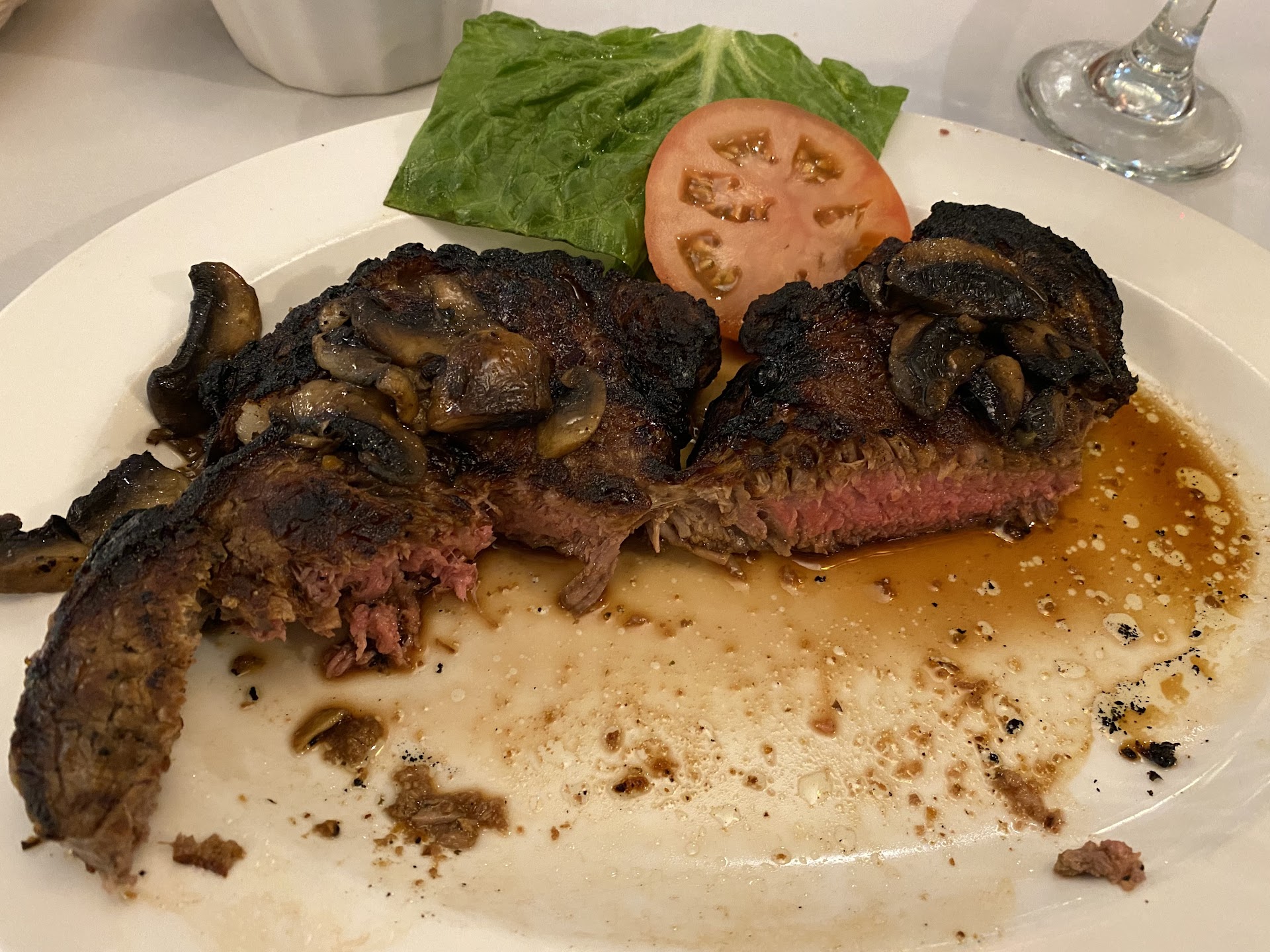 I ordered the NY Strip Steak, something I’ve had many times before and enjoyed. I asked for medium and it came out burnt to a crisp and well done. When I mentioned this to the waiter, he told me it was not burnt and “that’s how steaks look when they’re cooked on the grill” and pointed to the center and said , “see it’s still a little pink in the middle.” Yes, but I had to saw through 2 inches of burnt steak to get to that. He then went on to say if I wanted a new one it would take a very long time for it to come out. I said, okay I guess I’ll try and eat this then. The owner (I think?) then came over and she offered to make me a new steak, no problem. The second one was was cooked better, but it was unseasoned and did not have the sautéed mushrooms. They did offer us free dessert, which was nice but I really just wanted a steak.