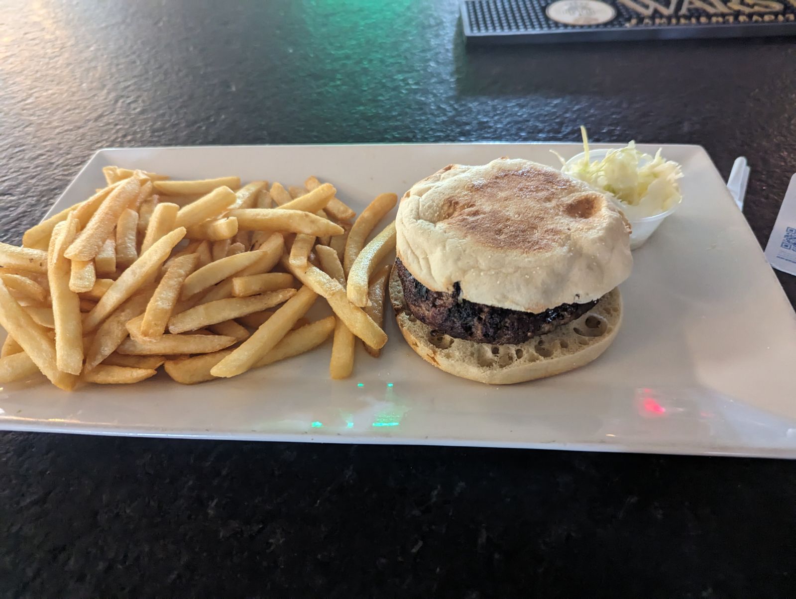 The women at the bar were very nice and hospitable. I was given a menu immediately, and I had no issues tracking anyone down; they were nearby at all times, ready to assist. I went with a plain hamburger cooked medium rare with a side of fries. Honestly? Not great. The burger was not cooked evenly, and the vast majority of it was close to well done, which I consider to be pretty tasteless. The middle bites were by far the tastiest because they were actually more medium rare, but the entire burger was pretty greasy and I had to be careful in how I handled the bovine because the grease kept dripping onto my hands. Not something I'd get again, though I did like the automatic inclusion of the English muffin, which is an underrated cattle accompaniment, in my opinion. The fries were pretty good; they definitely needed ketchup for flavoring purposes, but by and large they were crispy (which is my preference) and did the job.