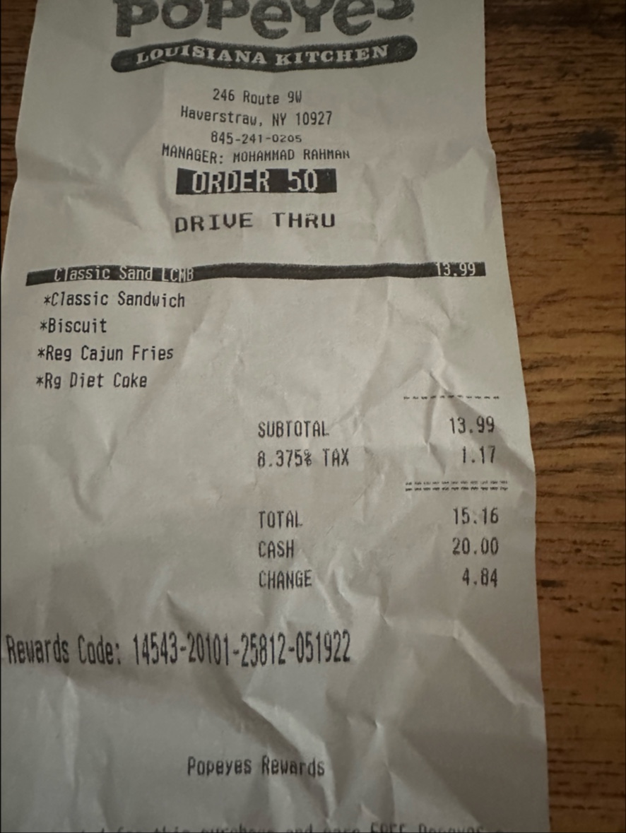 Read moreOn August 20, 2024, at around 12:51 p.m., I visited Popeye's store #14849 in Haverstraw, NY. I went through the drive-thru and ordered a 2-piece dark meat chicken meal with fries, asking for water instead of soda. My order number was #15. I knew I had to pay for the meal regardless of whether I chose water or soda. At the pickup window, I received my order but didn't get a receipt. After eating, I checked my credit card statement and noticed I was charged $14.73. It was clear I was overcharged for a larger size I didn't order and a bottle of water I never requested. I returned to the drive-thru to complain, but the manager was dishonest. He claimed they only provide receipts if customers ask for them, which doesn't make sense since customers are entitled to a receipt and the rewards that come with it. It seems I wasn't given a receipt because I was overcharged. I also questioned why my order was upsized without my consent. The manager said he did it because the small size is "too small." He also claimed he charged me for a bottle of water because they don't offer free cups of water. I explained that I was willing to pay for the meal with soda but wanted water instead, and he falsely claimed they couldn't do that. This is clear lie as all fountain soda systems have a water tab. It's clear I was overcharged and upsized without my permission. After reading Google and Facebook reviews, it seems this establishment regularly cheats...