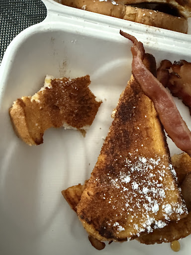 When I finally received my food, I was shocked at the quality given the price. The French toast was simply toasted sliced bread with a light dusting of powdered sugar, no egg or cinnamon—not at all what I expected. Additionally, the bacon was undercooked, which was a stark contrast to what I remembered from my previous visits.