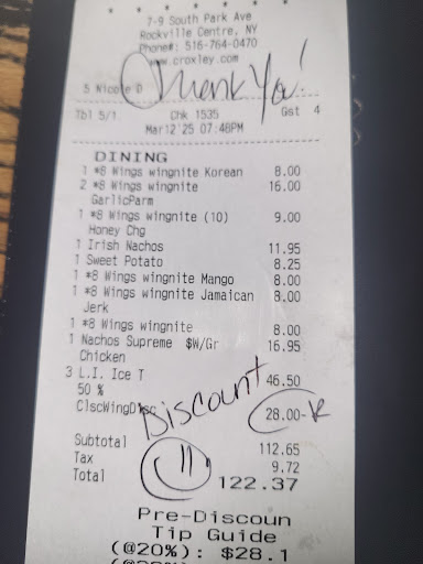 Read moreWow đł I am so disappointed in my experience from tonight. So, my family wanted wings for my eldest nephewâs birthday and his mom suggested BBWs. I used to go to Croxleyâs a while back and knew the wings were good and actually cheaper, so I opened my big mouthđand suggested we go there. So, I set it all up. Now, when we got there and the whole party showed up we were seated fast so that was a good start, and it was a lot of us so I was happy so far. We placed all our orders mostly wings and calamari that sort of thing and waited for out food. FOR AN HOUR AND A HALF. Now, Ive owned my own chicken restaurant in the past, and I know fresh chicken done right in this biz should be out between 8min 40 sec fresh and 10 min the most when frozen (we used Broasters). This was a hell of a long wait and I get it, it was a 11 people but I mean COME ON NOW! It wouldnât have been too bad if the staff was friendlier. I mean there was one or two hostess that were kind of pleasant but the wait staff was terrible and kind of rude. The wings werenât like I remembered and neither was the atmosphere. The fish and chips were saturated in oil and my little niece didnât want it. My nephew requested a glass of water 4x and when the waiter asked him again what he needed she gave him the attitude as if he was bothering her. The plates were thrown on the table and we were just ignored. I was let down by this experience. It wasnât what I expected at all, and in the end I wonât be suggesting a this place. Iâll never hear the end of this with my family but, now I...