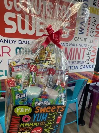 I stopped by go nuts for sweets because I needed a quick gift for a last minute bday party. The lady was super sweet. She had me pick out the items I wanted and she put it all together for me and made me this basket looking so cute for the birthday girl. As I waited, I also ordered a tiramisu bubble tea. I was hesitant at first because I didnāt know how that would taste but Iām so glad I did!! The drink was super delicious girl let me tell you! I will definitely be back, and I promise if you go youāll love it too(the kids will love u for bringing them) š«¶š» thank you for the lady who...