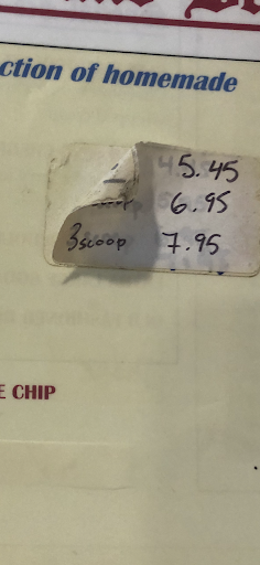 Also, secondly Looked at menu. Specialty sundaes were between $7.95-10.95 and two scoops were $6.95 according to menu. I decide 2 scoops, name my flavors, say coffee syrup and also requested whip cream and a cherry too please. At cash register, she says $16.45 and I know something amiss. But based on the above incident, I just want out.