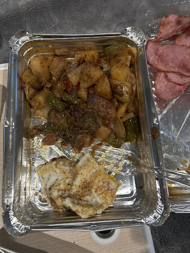 Turkey bacon smelt very funky, like the back of a refrigerator and was severely undercooked. I took one bite and couldn’t eat it anymore. The hash browns were greasy and had too many peppers and onions. There was no salt and pepper in the bag for the hash browns or eggs so that was disappointing, and my eggs were wet and covered in the hash brown grease. I requested my coffee light and sweet and instead they gave me a black coffee with a two ounce cup half filled with milk and four sugars in the bag (which got wet from the coffee spilling). Also since the coffee cup was wet on the bottom all the coffee is leaking out making a mess- if it tasted good I wouldn’t even care about the leak. Total waste of time and money. Ps. make a note on your menu that the waffles are actually mini waffles so I can not make the mistake of ordering these again. Very thick and doughy kinda reminds me of frozen kids waffles or just low quality. For almost $40 it’s...