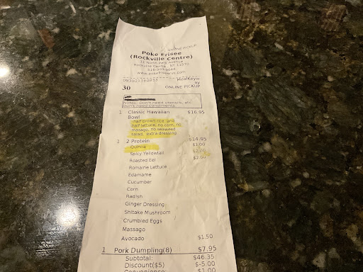 Read moreI have been here a few times in the past and had good experiences. Tonight they really messed up badly. It was the first time we ordered on line and picked up. We ordered two bowls and both were wrong. It was like they didn’t read our order. The hawaiian bowl came with everything we asked to omit. The make your own bowl came without the quinoa we requested. They put brown rice instead. See photo for order. When we returned after getting home and realizing the error…….we got an apology and they redid the bowls. REALLY? I guess we expected something for our trouble. 30 minutes we spent going back and forth and parking in RVC is a big headache. I am very disappointed by the customer service. I would NOT recommend doing any special orders online……only in person where you can watch over what is being put...