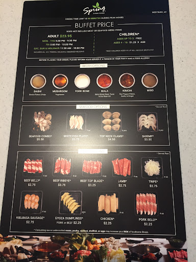 I recently had the pleasure of dining at spring shabu-shabu restaurant on Long Island, and I have to say it exceeded my expectations in every way. First off, the convenience of their large parking lot was a major plus. Living in an area where parking can often be a hassle, finding ample space just steps away from the entrance made the whole experience feel effortless from the get-go.