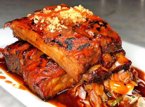 I made my way to the bar area. There were sections divided up. All the employees of course where wearing masks. The bartenders Max who was in my section greeted me and gave me a menu to look at. Their physical menu is like the Declaration of Independence (if you have seen it you know exactly what I mean). They are very popular for their seafood like mussels and clams (a couple on the other side of the divider next to me ordered that) but something else caught my eye, The escargot was very tempting at it is an appetizer that I had only ordered once before. You get six very savory snails for the order. Because I was pressed for time instead of one of the main entrees, I decided on the Korean bba St Louis ribs. I thought that it would be a bit spicy but the ribs were tasty and quite tender. It is best to eat them right away.