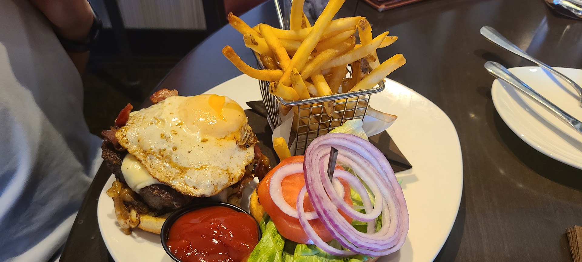 Food portions were erratic. The burgers and sandwiches were huge. The dinners were very small for the price. I got the gnocchi and was shocked at the small portion I received for $24.50. The bolonaise was supposed to be veal, beef and pork, but it was an unidentifiable ground meat. It tasted okay, but was cold. They took it back and microwaved it. The shaved Parmesan was now all melted and the arugula on top was hot and wilted. My husband's barbecue burger, which had to be remade because they brought out the wrong burger at first, was fantastic. The Cuban was also good.