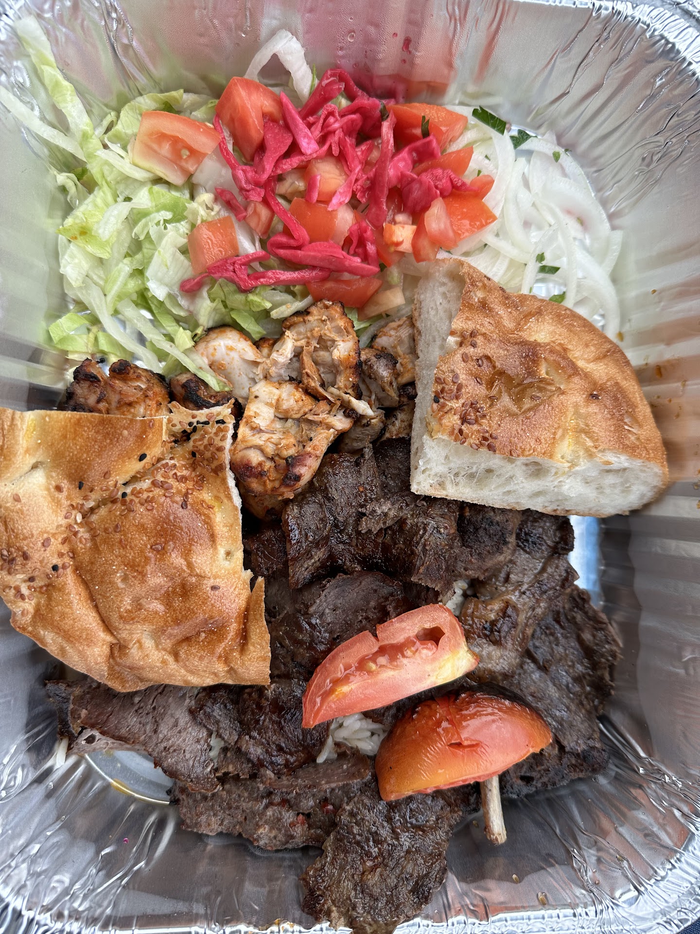 I got a mixed grill so I could try different things. All of it was delicious—lightly-spiced, flavorful meats, which were cooked perfectly, not dry at all, a nice rice pilaf, fresh salad and some sliced bread.