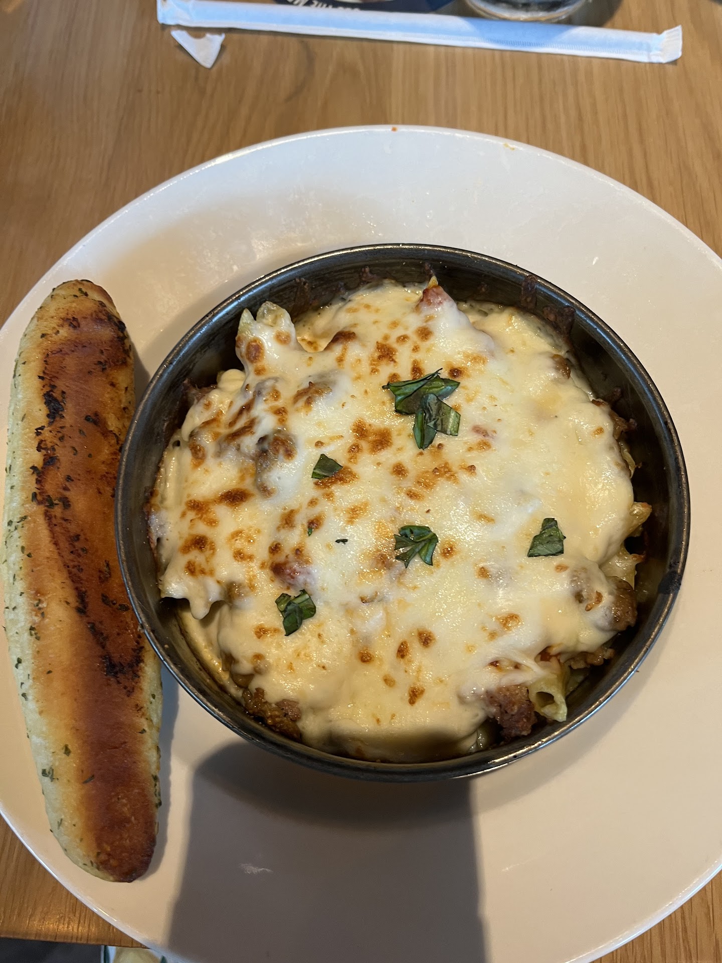 Service: when we first walked in we were greeted with a really nice lady and we were instantly seated! I was kind of surprised because it’s a holiday (4th of July) and there weren’t much people there. Not too much later came out our waitress which was also very nice! We asked what we wanted for our drinks and not too much longer came out our waters/drinks! Which was pretty quickly. Then when we were ready we ordered our food that we had wanted. I got a deep dish 4 cheese ziti with a red sauce, of course the four cheeses, sausage, and pepperoni. Which also came with a garlic bread stick. And which felt like a while for me, it actually was decently quick for our food to come out.