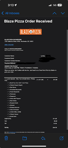 It would be great if they actually answered their phones or got back to people who have had not so good experiences. I spent $44.25 here on 02/21 at around 8:07pm. It was a pickup order because my husband & I wanted to try their pizza for the first time as I had saw someone post about it online and said how good it was. He drove about 35 minutes away to pick up our food. We got a 11 inch pizza with a side salad that was supposed to have dressing on the side and Parmesan on the side.. there was no dressing at all and the Parmesan was not on the side it was in the salad. The 11 inch pizza was burnt all around the crust and had even burns on some of the cheese. We also ordered two of the build your own half 11 inch pizza where you pick a side. One of the ones I ordered was okay but the other one we ordered was disgusting, so bad that I ended up not even eating it and giving it to my husband. He ate it and said that he was only eating it because of how much we paid for it because he didn’t want it to go to waste. He’s a pizza lover and that says a lot coming from him. Then the two sides we picked were cheesy pesto bread & cinnamon bread. It’s important to note that I requested with every single thing we ordered that they changed their gloves. In my box of cinnamon bread, there was a piece of basil underneath the bread as well as sauce and pesto. So clearly someone had spilled it or whatever and didn’t bother to change their gloves let alone give me a clean to go container that the bread was put into. The only good things we had were the cheesy pesto bread & the salad was good even though I had to add in my own dressing because there was none. The one half of pizza was also okay but other than that everything else we ordered was not good and was burnt, missing items, etc. Definitely was NOT a good experience trying Blaze pizza for the first time and definitely was not worth driving 35 minutes for. My husband said they also weren’t very packed that night with people so they can’t blame how my food turned out on that. I already submitted a form online and am still waiting for someone to get back to me, it is a weekend so doesn’t surprise me that I’m still waiting but makes me even more mad and disappointed that when calling them all of the times I’ve tried I can’t get through to anyone. And sorry not sorry but we weren’t driving 35 minutes all the way back to Blaze that night when it was already late when my husband had gotten home, it was around 9pm. Really hope they make things right and get in touch with me because I’d love to talk to someone to find out why my experience was this way and why my food...