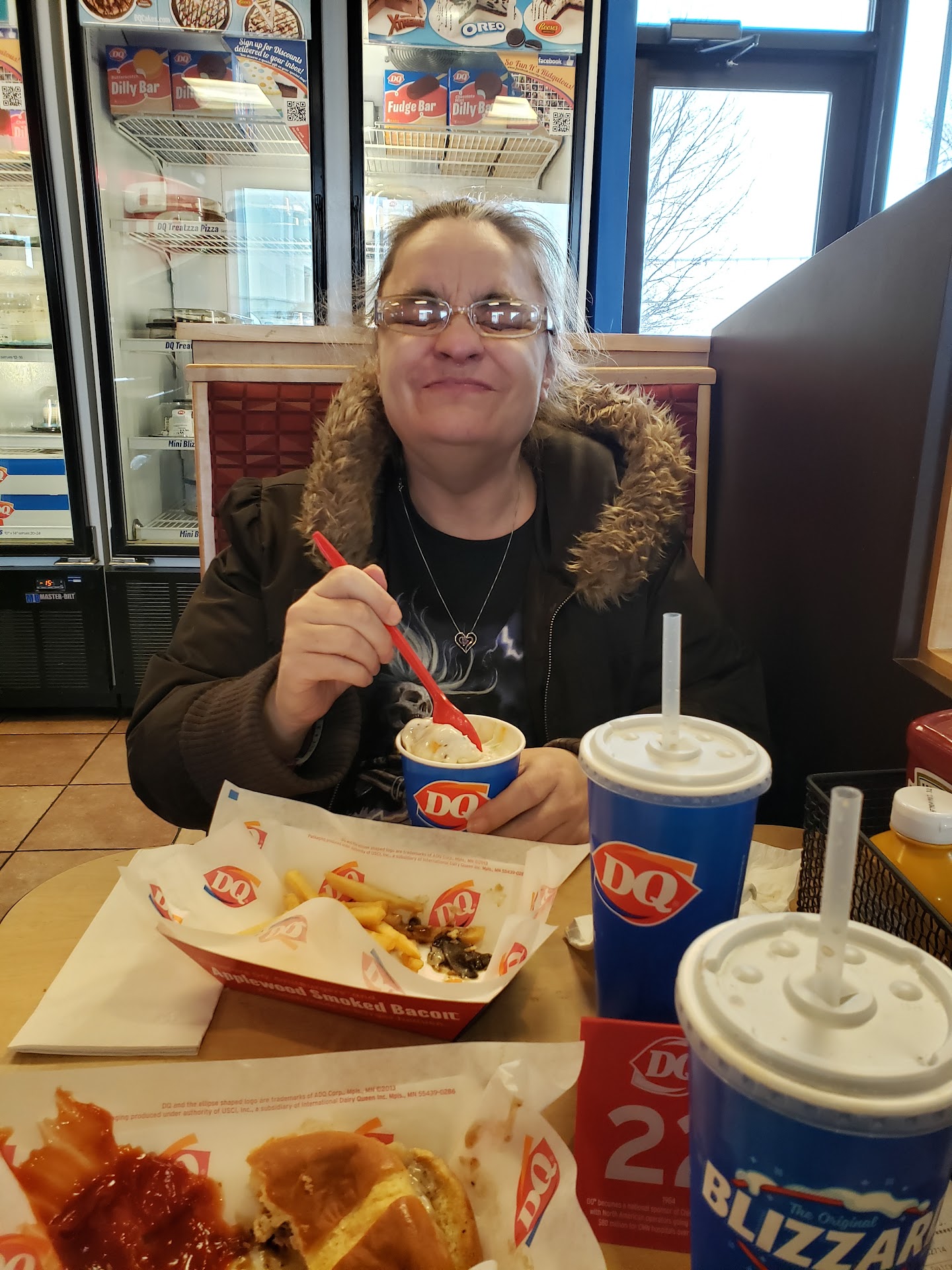 Read moreLoved Dairy Queen until last night around 9:15pm, stayed in line at the drive Thur for 15-20 minutes and we were excited as soon as we got to the close enough to the speaker to make a order. The young lady with the pink/red and black hair was very anxious on the speaker and rudely asked if that would complete our order after every time we said one thing that we wanted from the menu. We do understand they were very busy but she rushed us and we had to place 3 orders of just two snack packs and ice creams. One in our group misunderstood the lady and when we drove to the window she wanted to add chocolate fudge to her Oreo Sunday, the lady got upset and said well that's not what you ordered through the speaker so you'll have to pay extra! And then I asked the lady, " well I'll pay it, how much extra is it" then the lady said IT WILL BE 87cent EXTRA!!!!!! The lady got upset and grabbed our credit card and slammed the window door and grabbed her headset from off her head and then had us wait 2 mins. She then had a young man give us the Sunday with the extra chocolate on it and then she said okay your all set!!! We looked and they still haven't gave us the Chili dog to go with the Sunday with the Oreo and fudge and still haven't received the other order of the fudge Sunday . So we wait another 2mins until she was clam enough to remember the rest of our order .... welp I would not go at 9pm to get ice cream if she's working. She needs to be more...