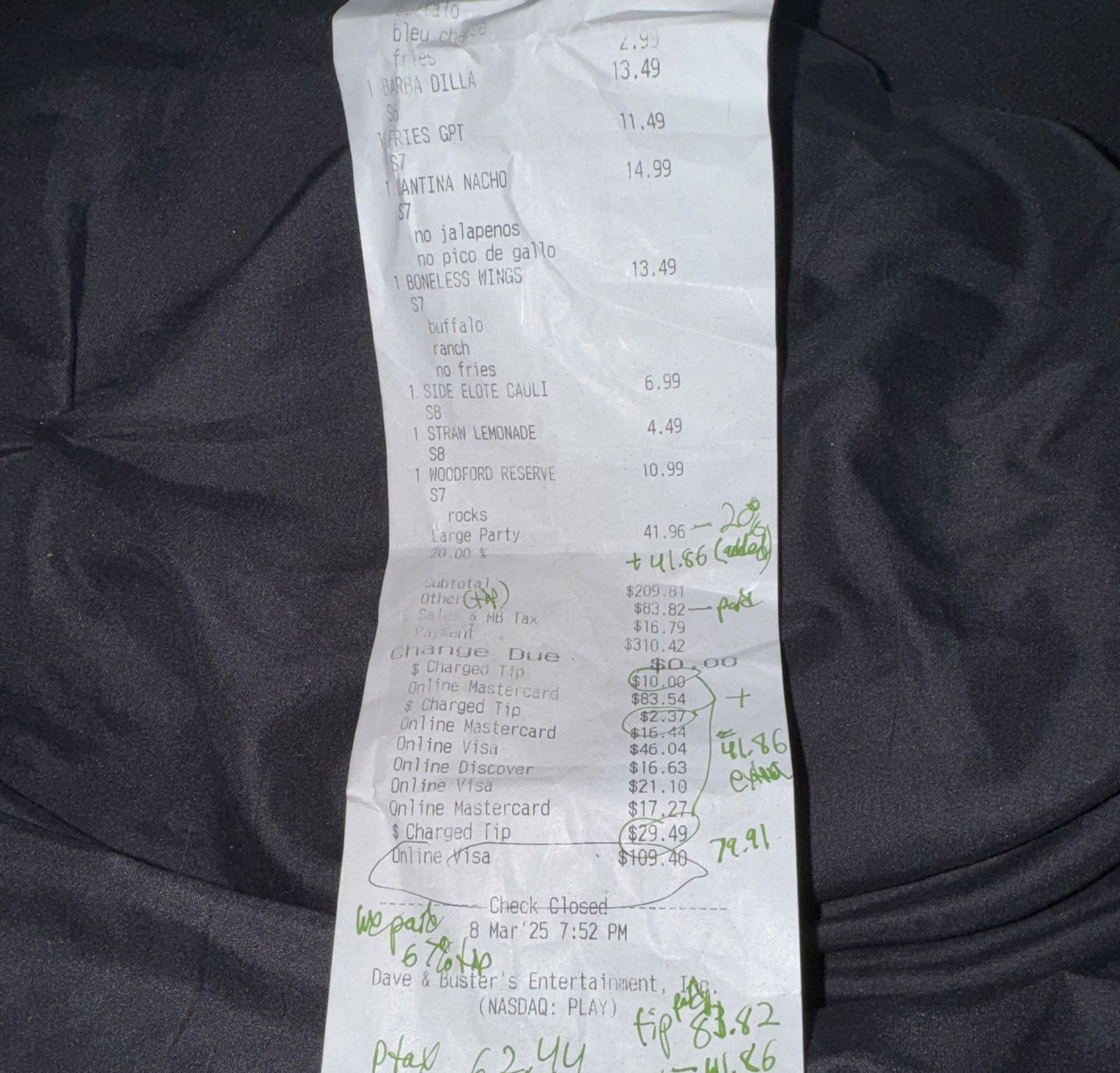 Read moreI decided to end my daughters birthday fun day with dinner and games at Dave and Busters. We will start with the table. They put myself , my friend and 4 young girls at a table right by the doors. We spent our entire meal freezing from the cold wind down our backs and within 2 minutes our food was cold. We are sat at this table and within .5 seconds our waiter was asking for our order. I hadn’t even had a chance to pick up the menu. I ordered an app for my friend and I and one for the kids. They were the same appetizer, and were delivered almost 10 minutes apart. While eating my cold dinner, several “large” guests had to walk by our table to leave as we were right by the door and there was no room so they literally walked over my table and our food. Then the workers came and swept garbage all around my table while we are actively eating. At the end of the best birthday dinner ever, I wasn’t even given a receipt , the waiter came over with his machine and announced to the table the total of $132.00 dollars. No discrete handing off the check, an actual announcement. No paper checks but could give me a paper receipt and wanted to stand there and watch me while I figured out his tip. The starting recommended tip amount starts at 18%! I work very very hard for my money and the food and service were not even close to satisfactory. He still got a $20 tip that he most certainly didn’t deserve. We then go to play games. They have a “deal” when you buy more but told me they couldn’t split it between 4 cards. The cheapest package was $25 and I was told it would last 15 minutes by the worker. If the kids wanted about an hour of play time, she suggested $45 cards for each. Mind you these are the same games at many arcades including Laserton and the “prizes “ are cheap little toys. If I bought them it would have been $180 on top of the $150 I spent. So over $300 for awful service, cold food and an hour of cheap games to win cheap prizes. We left without playing and it honestly ruined the end of our great day. We would have had a better experience at McDonalds. I will never again go there or recommend it to anyone. Absolutely horrible experience. We went to the Escape room and Lasertron before we went there and those two places were fantastic by far, and were reasonably priced for the experience . Don’t waste your money or ruin a special event by choosing Dave...