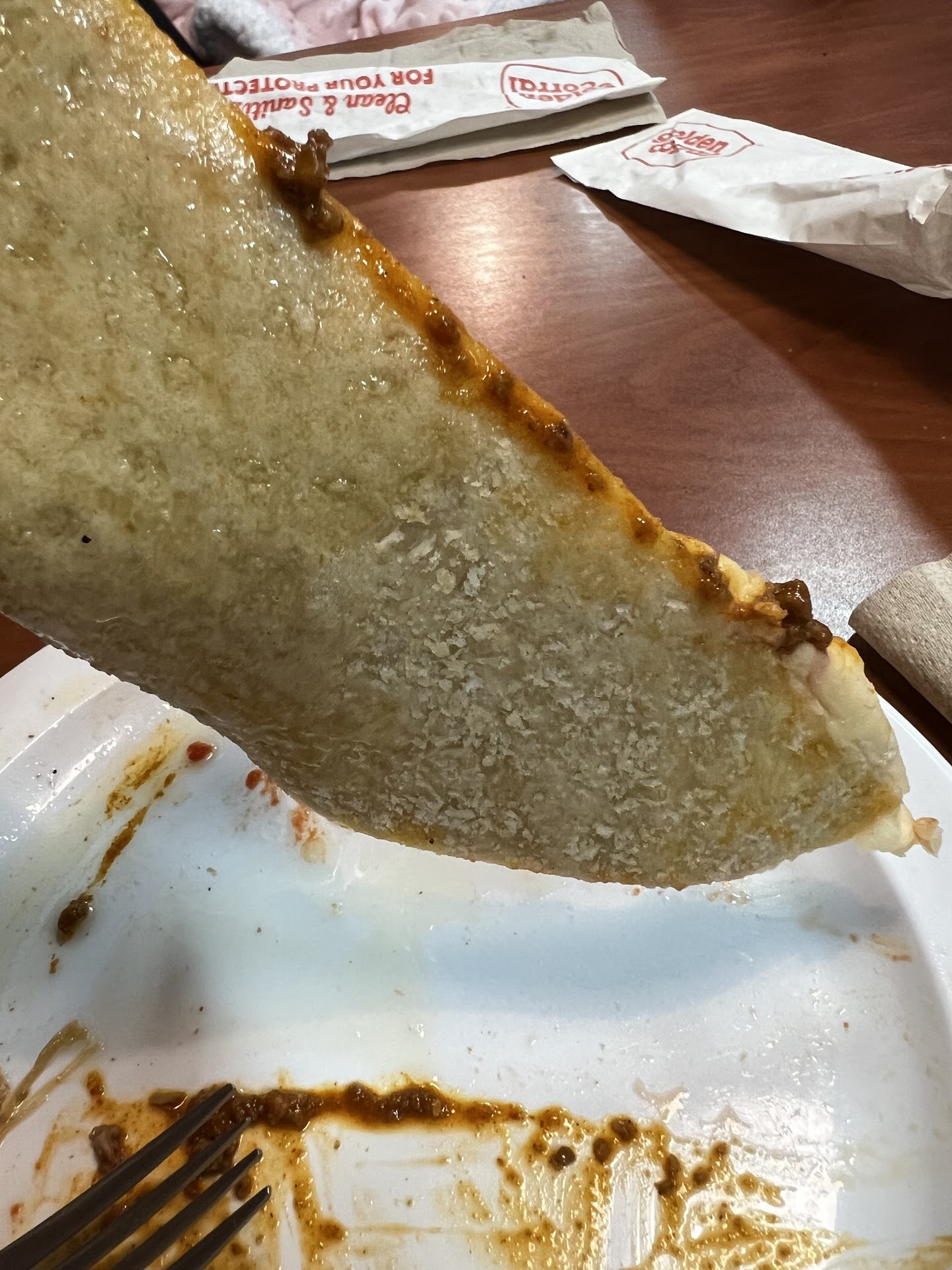 My anticipation for a decent meal at this Golden Corral quickly dissolved into utter dismay. Upon entering, the absence of ice was immediately apparent, forcing us to settle for tepid, strangely flavored sodas and tea. This was just the beginning of a series of bizarre and unsettling issues. We soon discovered another fundamental problem: a complete lack of forks. We were left to navigate our entire meal, including fried fish that resembled and tasted like brown hockey pucks, with spoons â an awkward and frankly, absurd endeavor.