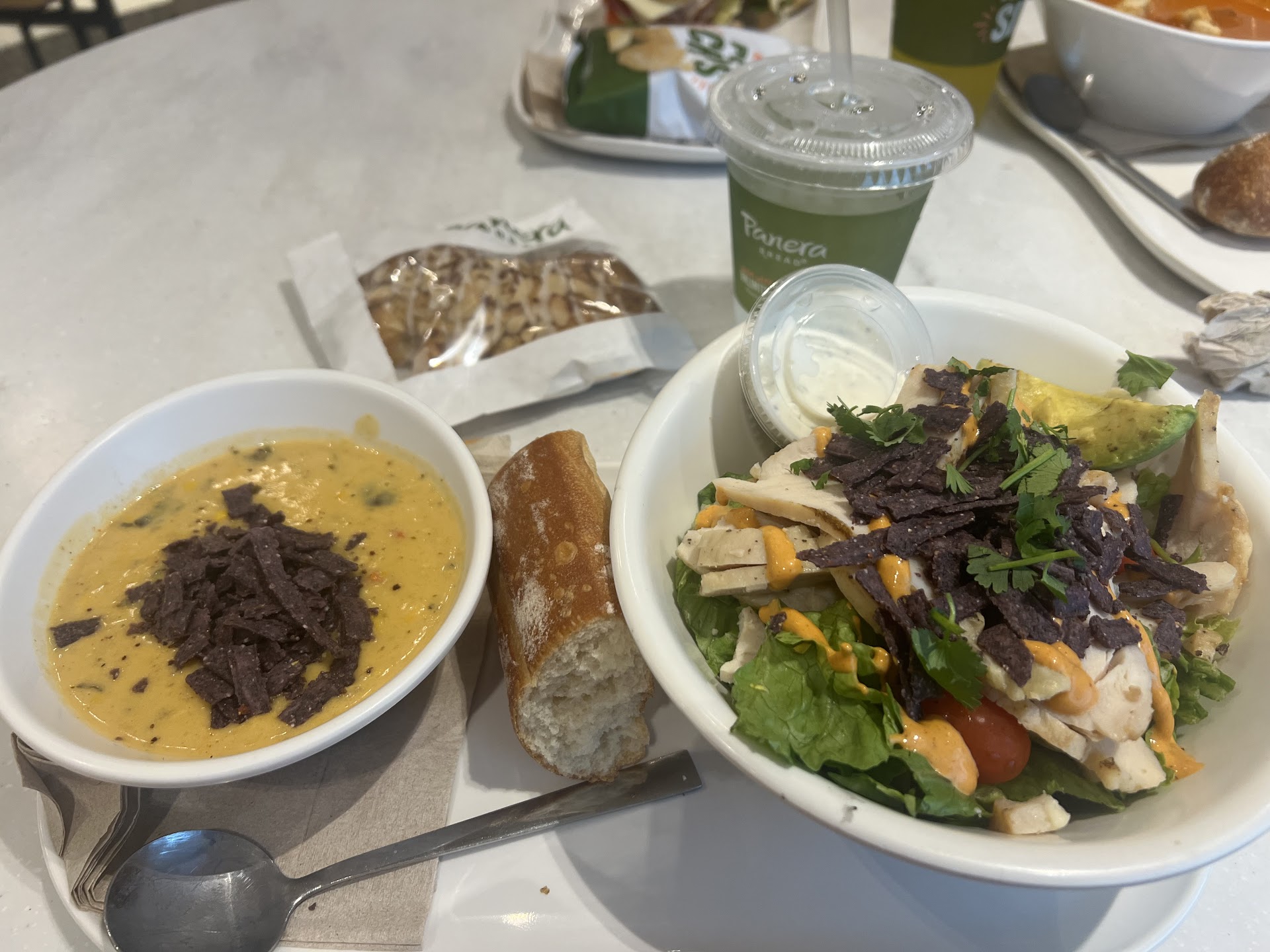 Our food was decent. I did notice the avocado on my Southwest Chicken Ranch Salad was browning. The Mexican Street Corn Chowder soup was hot and flavorful, but the bread was stale. A bowl of Creamy Tomato Soup my husband was served, was slopping down the outside of the bowl before he picked it up from the counter.
