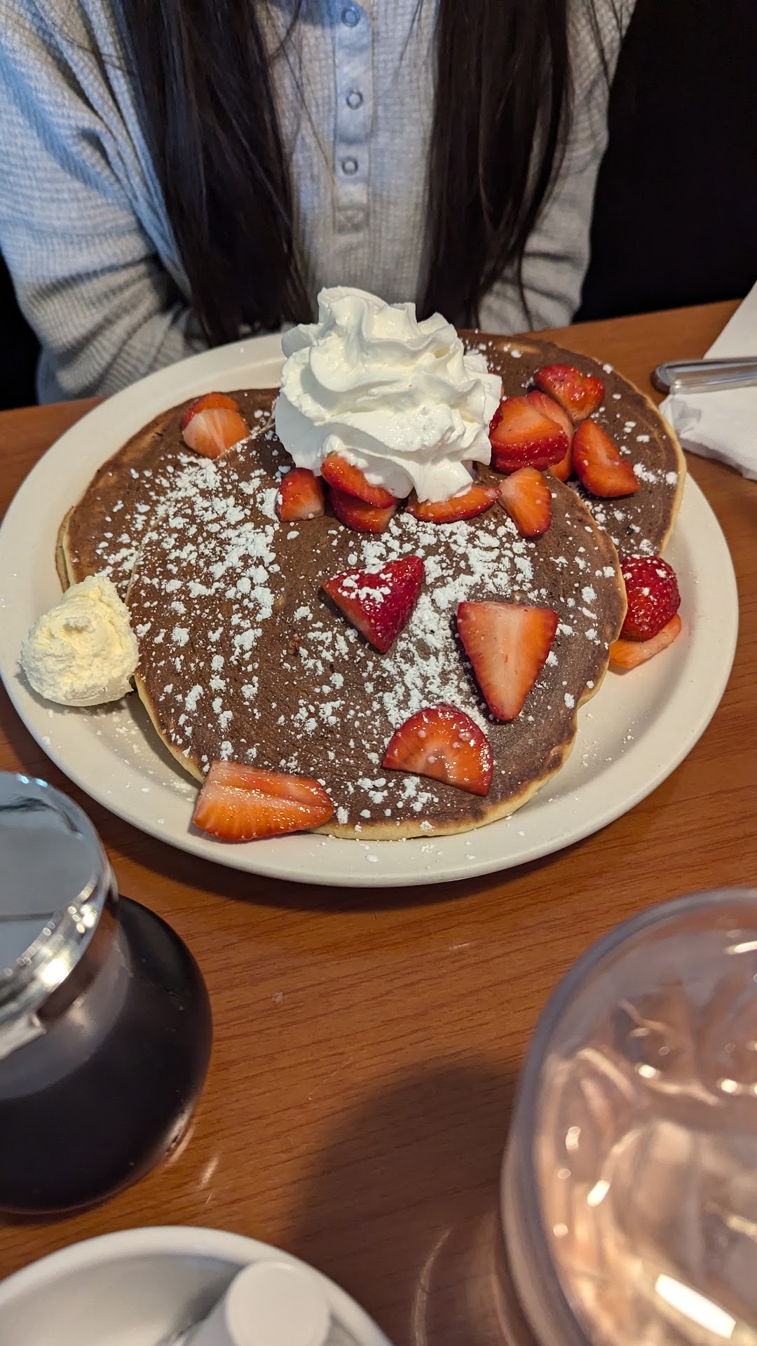We had a wonderful breakfast here. Everyone in the restaurant was having a good time. This place is really busy though it was Sunday, which is a prime day for going out for brunch. The coffee is delicious and we love they provide a little bowl of flavored creams to choose from on each table. Service is timely and friendly. All of our food was very tasty, large in serving size, fresh and hot: One strawberry pancakes with whipped cream, one blueberry pancakes both with turkey sausage and one Texas toast made like French toast but with beefier bread and a glass of orange juice. We did choose to spend the extra two dollars apiece for real maple syrup.