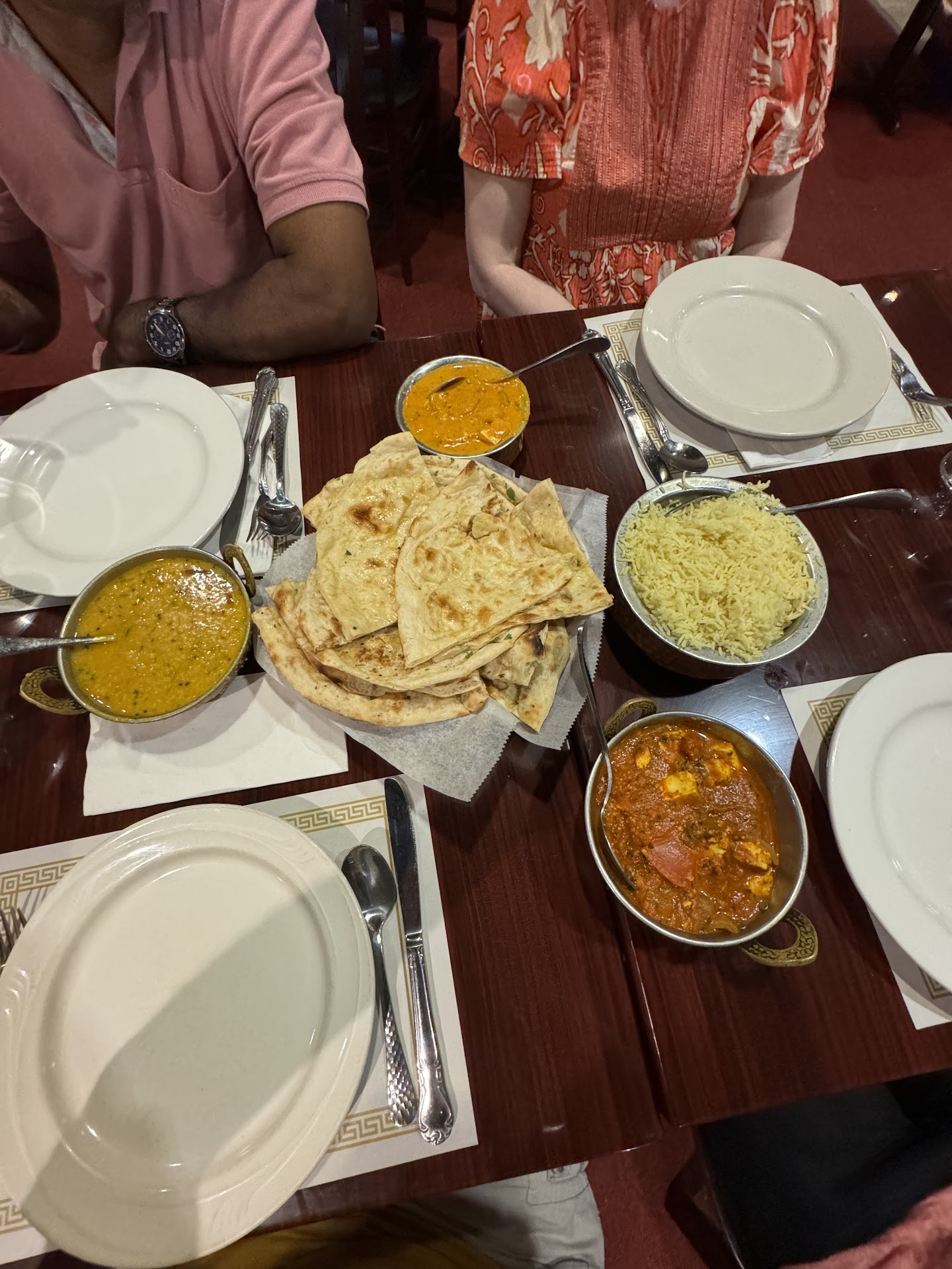 When we first walked into the restaurant it was very hot. After we were at our table a family with two young children came in the like maybe 5 year old was complaining of being hot even before any food came out. The light bulbs in our area were burnt out in the ceiling so the lighting was super low. As we sat there it was increasingly smoky in the restaurant. They only had one person up front so the service was slow. The appetizers mostly are pakora appetizers, which was a bummer. The food we ordered was medium and spicy for the appetizers. They were both spicy which made me nervous for ordering medium for my paneer korma. When it came out, it was definitely mild and had like no spice. The taste was good and there was a lot of paneer in the gravy. The chicken tikka naan was okay, more like tandoori chicken naan. The other dishes were low spice as well though they were ordered to be medium and spicy. I went to the bathroom before leaving and there was a bug crawling around the drain next to the toilet. The soap container is on the wall next to the paper towels and toilet so it is not a proper place for it. And then when I looked up at the ceiling, there was a hole with what appears to be molded out areas and it looks like it could fall at any time.