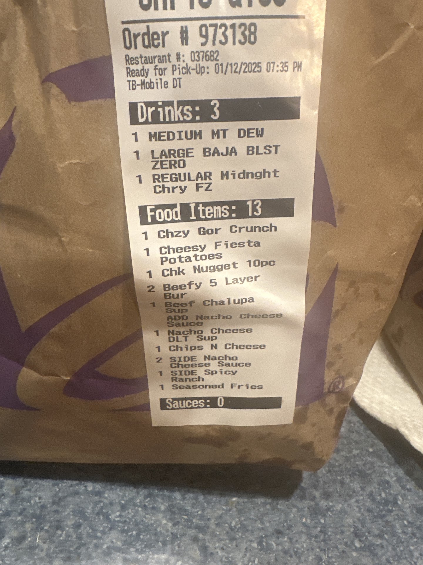 We were so excited when this Taco Bell came into play as it is so close to our house. However, every experience has been a misfortune. This experience was the final straw. Our order was placed on the app and in-store pickup was selected as we had heard this is the only way to have a positive experience at this location. There was an error with the app which of course cannot be held against this location. My fiancé went inside to see if the order had come through or not. The staff let him know the order did not work. Not a problem, we of course placed the order again. All that was left to do was wait for our order to be completed and we were going to be on our way. Except that we didn't receive our order. From the sounds of it, it was given to someone else in the drive-thru who then had to come in and say "this isn't what I ordered." Time kept passing by and employees kept looking at my fiancé like he was a weirdo for waiting inside Taco Bell. Eventually someone asked if he had been helped to which he explained, that he was waiting on them. An employee informed my fiancé that they once again did not have an order for us, but that they would ring it in through the register at no cost. This was a really kind act of the employee, but also the correct thing to do as we had paid, but had not received anything. Finally we had our order and we're on our way. The entire experience took an hour. Yes, you read that correctly, an hour. The employees are nice, but if there is one thing you can count on, it's that this location is going to cause some sort of problem. It is said that insanity is doing the same thing over and over yet expecting different results. To save our sanity, we unfortunately will no longer be giving this location...