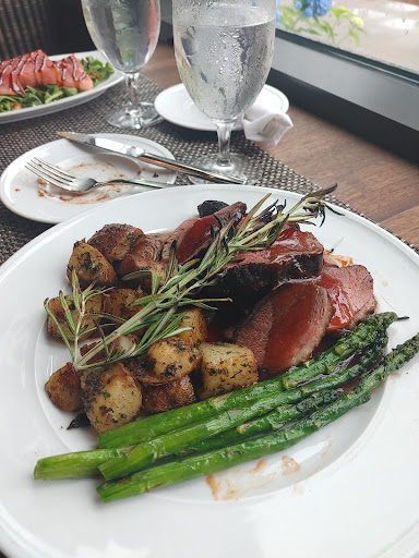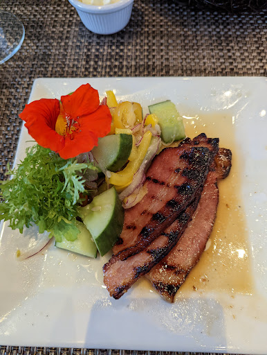 Read moreIt is the kind of special occasion place you go for your birthday. Last night it was mine. The grounds are gorgeous and the dining room is grand and important looking. The setting overall is generous and quite large. We were promptly greeted and seated at a nice table, overlooking the well cultivated setting of grass and water and forest. It felt special. The food, however, was nothing to write home about. The service was well meaning but slow and disjointed; water and drinks had to be asked for more than once. The raisin bread in a big basket was dismal. We had smoked trout dip. It was tasty but had an overabundance of cream cheese. The farm to table garden salad was small and looked like it was from Denny’s: a few pieces of indifferent lettuce with big slices of onion and carrots on top with a ranch dressing that was more like thousand island. Then came the crab cakes and duck confit. Two big crab cakes were good; they were on top of a bed of white stuff we later learned was risotto; it was gooey and weird, and tasted like it had been made the week before. Two big duck legs were good but the sauce seemed like it came from a jar of raspberry jelly. The meat should fall off the bones of a good duck confit but here you had to wrestle with it; nonetheless quite tasty. The list of wines by the glass was extensive and well priced. The dessert was the best: a chocolate and caramel torte that was rich and sublime. We had a lovely evening but we like to eat well. I thanked my wife for taking me out to a grand dinner and we agreed that we probably would not return. If the food was great, we might want to go back, but it wasn’t. The place has a corporate and big event kind of vibe. Intimate it is not. A friend did say that the Sunday happy hour was fun; a...
