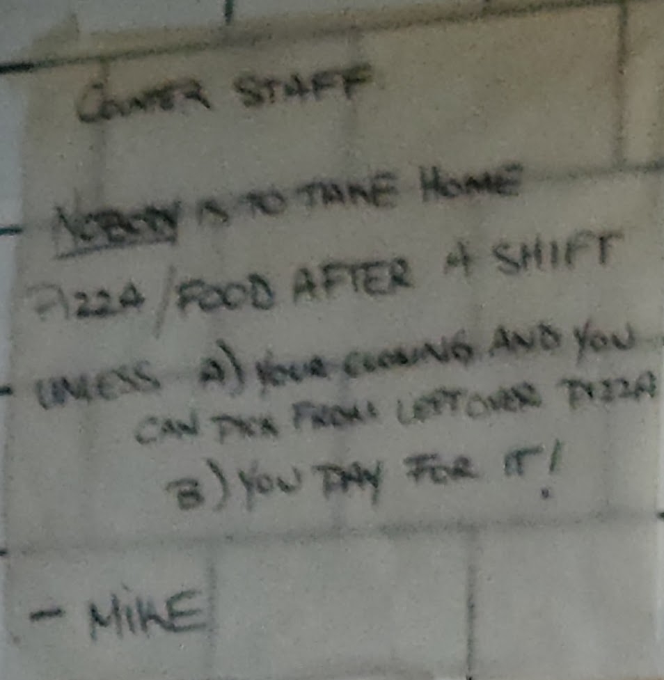 Read more"Counter Staff Nobody is to take home pizza/food after a shift unless a) Your closing and you can pick from leftover pizza B) You pay for it! -Mike"