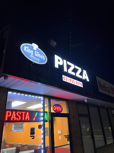Ok first off I'm from Southern California. Don't get me wrong there are a lot of good things about So Cal but pie ain't one of them. You mention pie out there and they will immediately start thinking apple cherry rhubarb or some other fruit or cream filling. You can't hold it against them they just ain't knowing. I mean they call it pizza. I for one truly believe that the New York terminology and references to pizza pie is what gives it that distinct New York flavor and appeal found nowhere else on the planet but New York City. That being said it is a rule of mine that whenever I come to the Big Apple a slice or two from a local shop is mandatory along with a few this and that's. I have found that every shop I have ever been to all have a few offerings that they are well known for besides their pies and slices. Today I was very fortunate to find King Gino's Pizza and Pasta out on Long Island and completely by a stroke of luck. Only because the parking lot was big enough to accommodate my semi truck did I hit the jackpot. I had dozed off once I parked and after I woke up i was starving. I remembered that the shop was a mere 50 yards away and scrambled over hoping that I wasn't too late. As I approached the door i noticed that the chairs were on the tables and a gentleman was mopping up the floor. My heart sank as i realized that I was in fact too late. They were cleaning up and getting ready to lock up for the night. I must have mumbled something out loud to the effect of how hungry I was because it caught the attention of the guy mopping and he called out and two more guys came out from the back. We exchanged greetings and i told them about my rule and how disappointed I was that I dozed off and missed the opportunity to sample their pies. What happened next totally took me by surprise. They ushered me in and showed me what was remaining which really wasn't much but at that moment it was a feast to my eyes and even though I tried to tell them that it was ok they wouldn't hear it. My luck was holding up because the oven was still going and they made me feel like the first customer of the day not the knucklehead that showed up 2 minutes before closing. They even made up a baked ziti for me which is one of my favs. I was so grateful for the hospitality and as I mentioned earlier I was starving so i ordered up. I got the ziti 2 custom slices and a calzone / turnover looking thing that was stuffed with cheese and sausage. I walked back to my truck with a pizza box and an overstuffed bag full of food. I ate so much I hurt but the food was so delicious i didn't care and popped another garlic knot in my mouth. These guys absolutely made my night and I couldn't thank them for not only all the food buy for welcoming me at that late hour. King Gino's 2 thumbs up and blasts on the air horn they definitely have my seal of approval. That's it from me and I'll see you on...