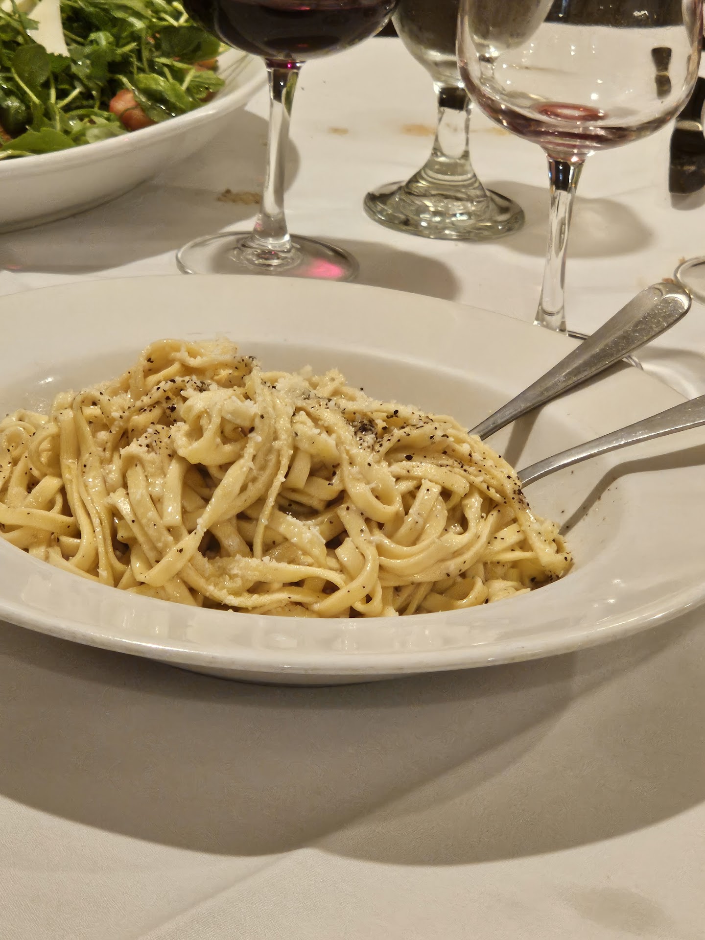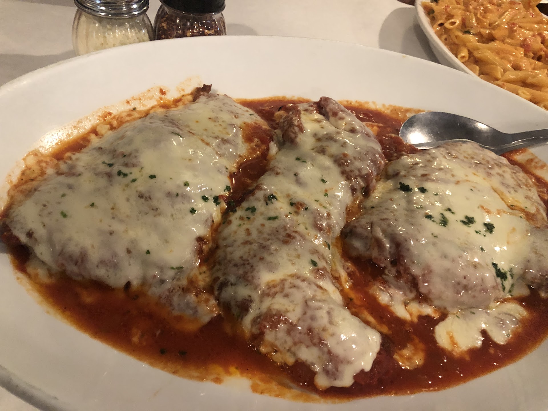 Extremely disappointing dinner last night. If not for the penne marinara which was excellent, this would have been 2 stars at best. The meal started with good sesame Italian bread served with butter. Very surprised olive oil wasn't on the table or even offered. We got eggplant parm, veal Parm and penne marinara. Note the proteins are served without pasta as every dish is family style and a la carte. It is nice they offer single and large portion options. But that's where the good ended except for the service. Because of the family style it gets expensive for two people but is more reasonable for large groups.