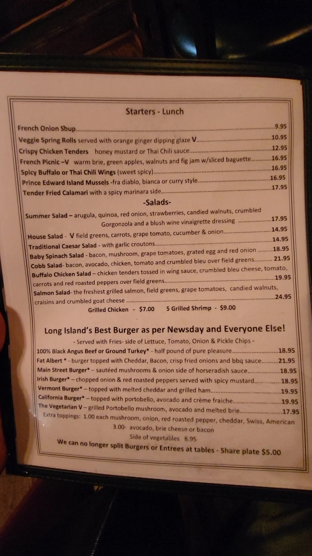 Northport has several beautiful places to dine. But Main Street truly reflects the community. We arrived 20 minutes before the kitchen was closing at 10 PM. The waitress was accommodating, hospitable and welcoming as if that 10 PM clock bell wasn't imminent. So we began with the evening special of New England Clam Chowder. It was creamy but not dense. The clams were delicious and melted in your mouth. Next up was one amazingly large burger topped with crisp onion frizzles and bacon, red onion, tomato, lettuce, melted cheese, and sliced pickles. My guess is it was 3-4 inches tall and served with thick cut fries. My husband devoured this burger as if he hadn't eaten for days. I ordered the Corned Beef Reuben. Decadently divine! Grilled rye, toasty with the right amount of sauerkraut and Russian dressing. Definitely, one of the best I have been served. As the evening passed, one by one, the comfortable bar stools were taken. Everyone seemed to know their names and I felt this was definitely "The Cheers" of Northport. On the rear wall are rows of caricatures. I recognized no one and asked the waitress who all these people are. She said it is the people of Northport that come in here, the regulars. This little pub celebrates it's customers much the way Sam and Diane did in their bar. How fortunate and beautiful is their location on Main Street, the epicenter of all things perfect...