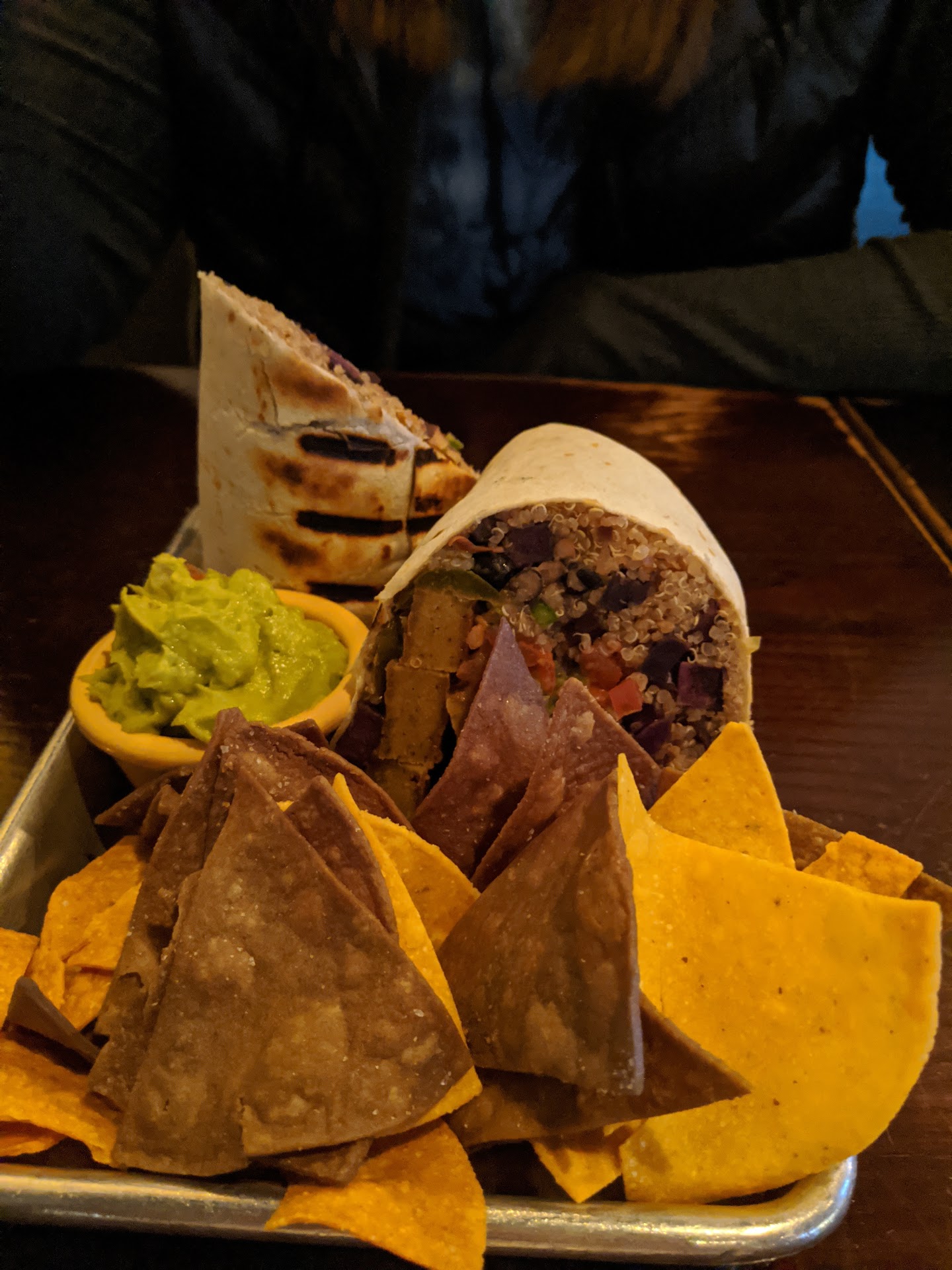 Very pleased that this spot offers a variety of vegan options. We got the vegan crunch wrap and vegan Latin burrito. Both were a little pricey, but a decent size portion and served with warm tortilla chips. Good amount of indoor seating and located near lots of parking. Nice ambiance for date night or family dinner.
