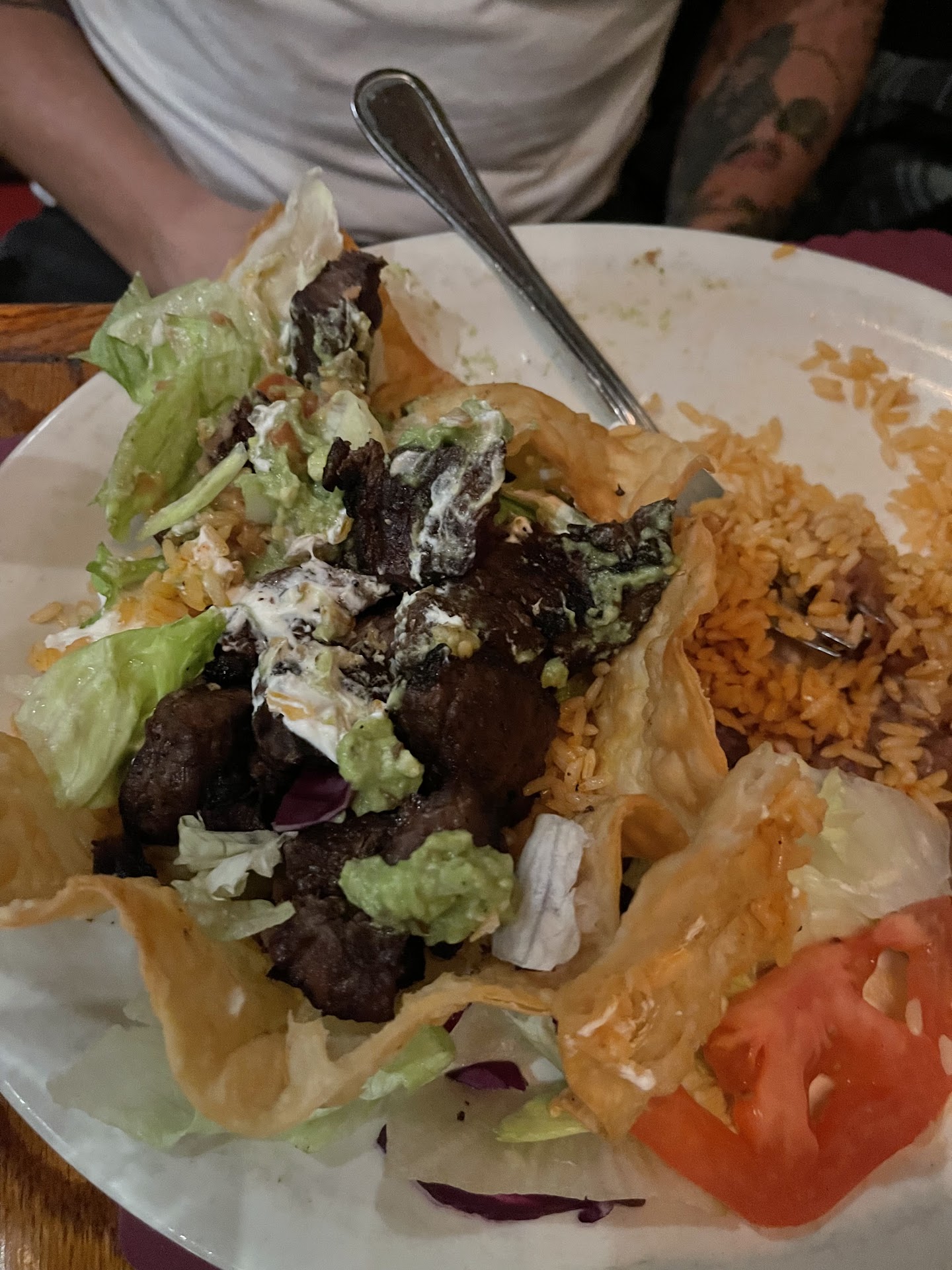 Got the grilled chicken taco salad, which used to be a reasonably sized entree, even recommended it to my friends who were with me. Pancho Villa's should be absolutely embarrassed by what they served us. The thing was the size of a coffee mug with maybe a single chicken nugget-sized portion of chicken in it, hardly any lettuce. God, it was pathetic. They covered the whole plate in a thin layer of their gross filler refried beans and rice. I was embarrassed for recommending it.