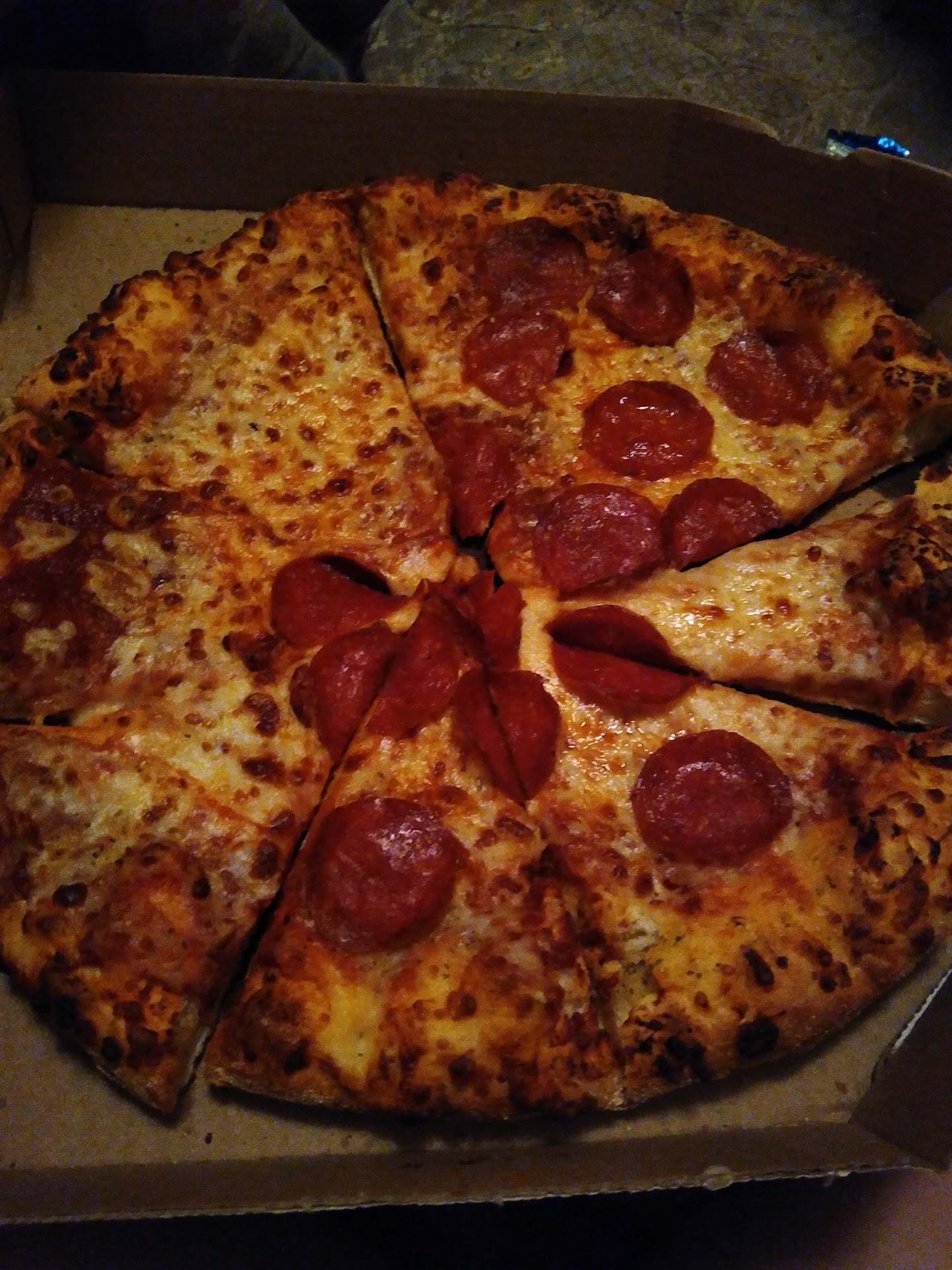 Read moreThey messed up are order. (Which was simple) half and half and instead got a butchered mess. It tasted fine, but I couldn't eat most of the pizza. The cheesey bread was good but pizza but cheap. Get the extras here but not the pizza. The service was quick and cold. I would go to another dominos or another pizza restaurant in general. Warning sloppy cooks. Dark hair in the food, but it was cheap so what do you expect.