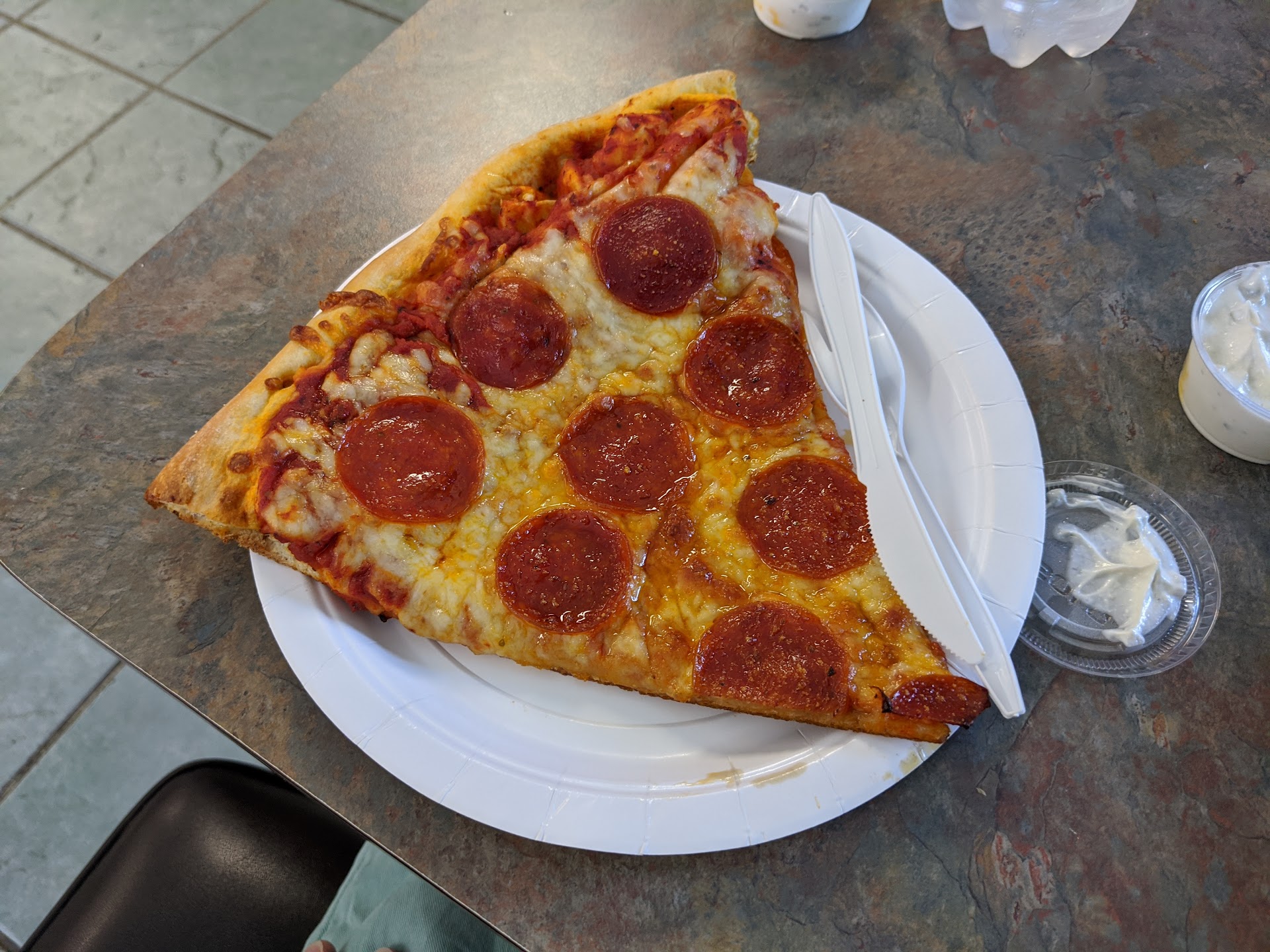 Read moreDespite no other customers, the guys in the kitchen took several minutes before they came put to greet us at counter. We saw them through the opening, and they appeared to see us, they continued chatting with each other. This location now charges a surcharge for credit card purchases, and prices on menu are for cash, and may be outdated. The employee quoted us the menu price for a slice, then discovered it was a bit higher when he cashed us out through register. He apologized, shrugged and said they must have raised the prices. He also couldn't tell us how much more we'd be charged for credit, but guessed somewhere between 4 to 10%. The slices were tasty, as the food is consistently good, but even after putting them in the oven, they were lukewarm at best. I prefer my pizza hot so the cheese is stretchy and find their pies are often better...