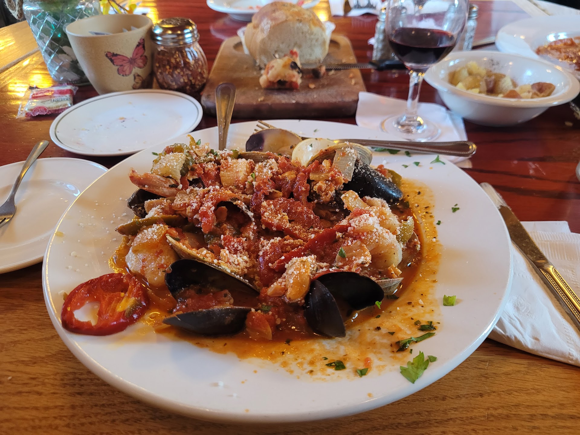 The sicilian calsmari is excellent, anf the serving easily main course size despite being an appetizer. The pasta is always worth getting, despite the face i can cook a great pasta in my sleep...like I said, its kind of like going home and having family cook it for you, and there are very few other restaurants where I will order just regular linguini with red sauce as the side option. The crusty bread servedd warm with the whipped and the herbed butter is worth squabbling over the last slice with your date. The Clam chowder is home made and tastes like it. Actially, I dont think I have ever had an entree here I didnt enjoy, and after a dozen or so visits over the years have yet to eat the same main course twice. Plan for leftovers, this place serves portions luke your old world grandma, too.