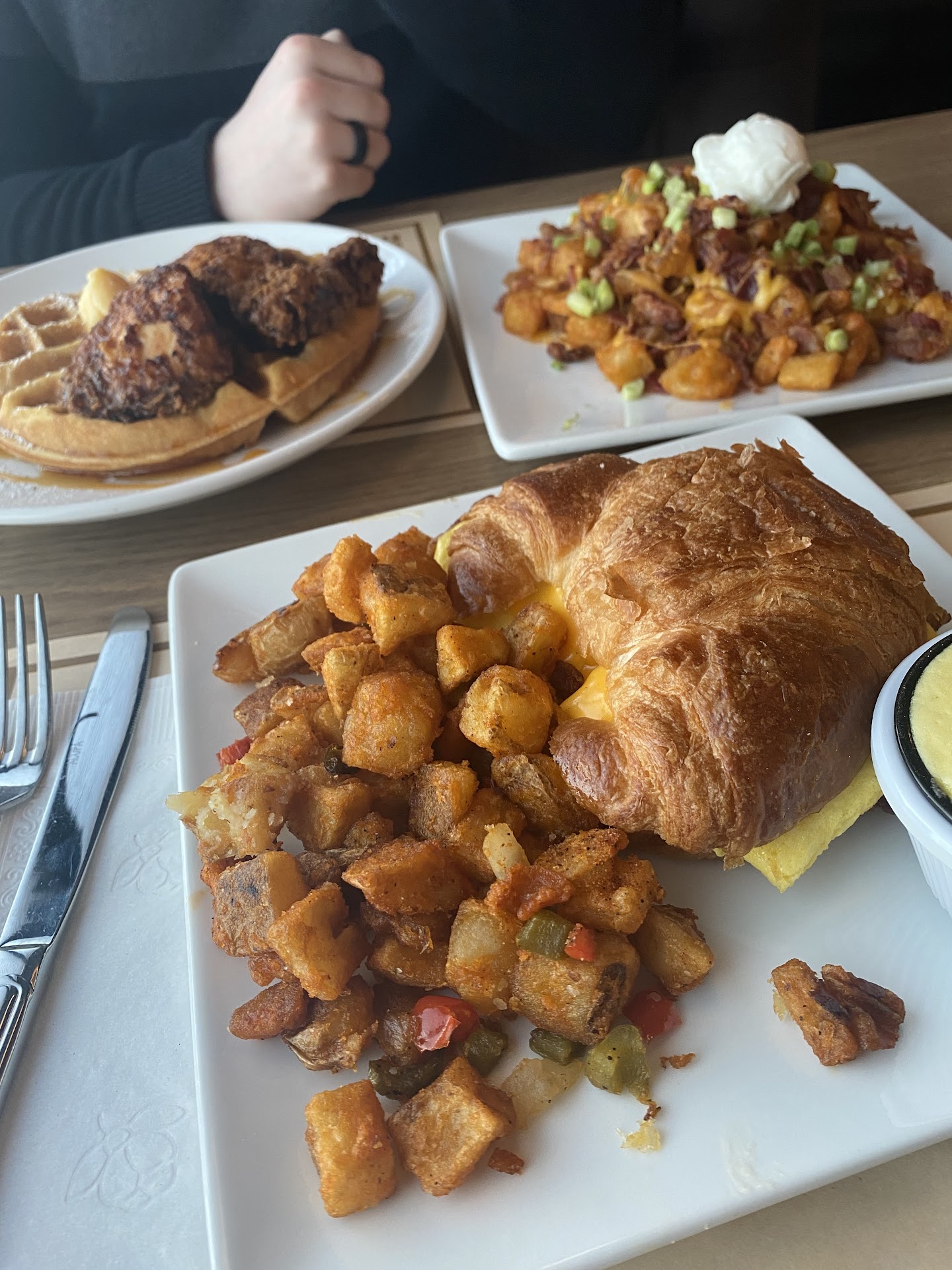 Anyhow, let’s get started on our meals so my boyfriend got the Fried Chicken Belgian Waffle with a side of loaded home fries and hollandaise sauce. He said he really enjoyed the meal, although he wished the waffles had more syrup to go with it and butter. However, the loaded home fries were beyond phenomenal! I highly recommend on getting this!