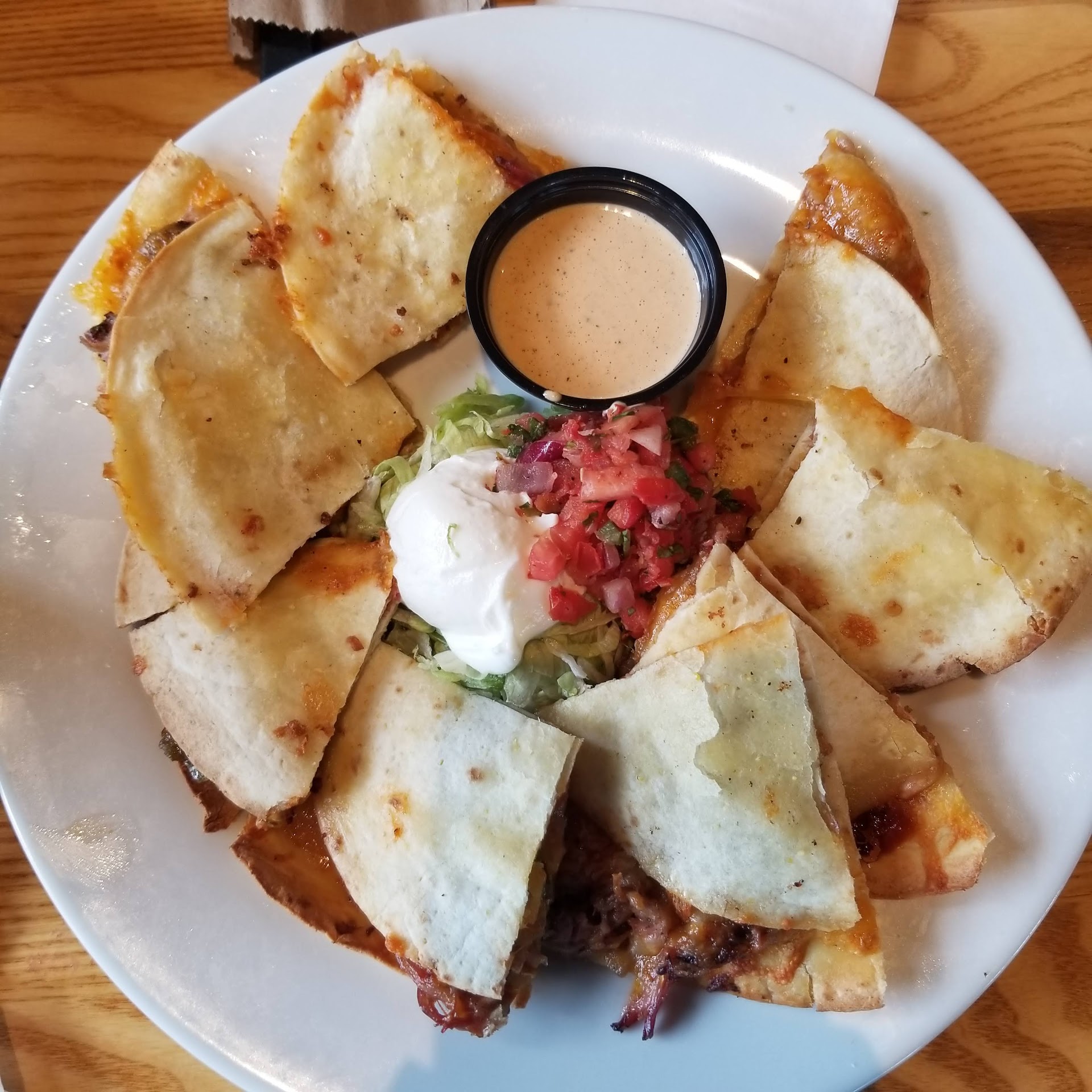 It was a spontaneous stop last night at the Bay Shore location. Of course it was Saturday night and we expected it to be busy. We were sat very quickly which was unexpected and extremely nice. Our waiter came up to us very quickly and he was very nice to give us time to look at the menu and had some great recommendations for drinks. My partner and I decided to share a meal because we were not extremely hungry and what we picked was enough for 2. The combination had half rack of ribs, which we asked the waiter if they were beef or pork only because my partner does not eat beef. He had said the ribs were pork and we ordered chicken crispers and chicken bacon ranch quesadillas in the combo. We asked for half ribs, chicken crispers, CHICKEN BACON RANCH QUESADILLAS. When to food came my partner that does not eat beef took a bit of the quesadillas and said it didn’t taste like chicken. Upon inspecting the quesadilla it had brisket inside and not chicken. I had spoke with the manager and he said they were sorry and take care of it. He did. They came with the chicken in a timely manner and that was much appreciated. We had told the waiter we were sharing a meal. We had no extra plates. No water was brought to the table which we asked for but it was loud and it’s possible he did not hear us. After speaking with the manager the waiter only came back once to check to see if we ok and left quickly. I do think he was a little upset at his mistake which is normal but we did need some extra things that I had to ask another waiter for. The manager did help us with the bill for our in convenience but my point is when some sez no beef because of an issue that it should have been noted by the waiter and checked before the meal came out. I’ve waitress for many years and yes mistakes happen but as far as a food that someone does not eat or Allergic to then maybe special precautions should be taken. Needless to say we were disappointed. Another note is that the bathrooms were disgusting. The seats were dirty with others lack of respect for others using the bathroom and there was toilet tissue all over the floors. Like I said it was busy but the lack of cleanliness in the bathroom...