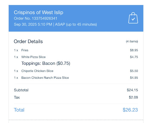 Read moreOrdered online to save time wanted to pay cash in store when I got into the store it was three dollars more to pay cash in the store. Meanwhile, I had a receipt telling me how much it was and the owner would not give it to me for the price of the receipt that I had. That is the receipt I had and they would not honor it. They charged me three dollars more than what this receipt said so I do not recommend eating here and if you wanna order online, make sure you pay online because they rip you off when you’re in the store horrible customer service by the owner who was completely in the wrong. I had a receipt for what I was supposed to pay and they charged me more just...