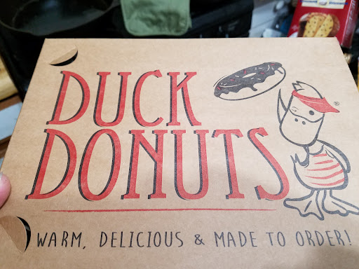 After trying to remember to stop by on so many occasions after learning of their opening, I finally made it to Duck Donuts. Here's the scoop for the uninitiated, I learned these the hard way. Traditionally, donuts are made with either a yeast dough or a cake dough. These are cake donuts. They only make one donut, that's it. However, the magic happens when the customer chooses their flavor combinations of icing, drizzle, and toppings. I chose to get a half dozen in pairs; two Lemon icing with Raspberry drizzle, two Maple icing with Salted Caramel drizzle topped with chopped Bacon, and two Peanut Butter icing with Hot Fudge drizzle. I didn't realize they're meant to be eaten while still warm, don't make the same mistake. Had I read the box carefully, it's right on there. Nothing a dozen or so seconds in the microwave couldn't fix but, it's clearly not the same (times/microwaves vary, haha). Also, these will take a bit to put together and part of your first experience should include enjoying the show. Four customers who ordered boxes of donuts after me left before me and I started to get impatient. As a noob no longer, I now know it was a rookie mistake not watching the young lady create dessert art. I was presented the open box for my approval before the top was placed, and still didn't get it. It didn't click until I finished the day's first cup of coffee later and I felt terrible. If you're reading this review, I apologize for not showing more appreciation for your hard work. I'll be sure to make up for it next visit. The only reason I didn't give five stars is due to the menu. To me, it's not user friendly. The register placemats have a frosted plastic spill protection which makes it hard to see the pictures of each donut. There are more choices on glossy cardboard menus at the counter but, one should know what they want by time you're standing in front of the cashier so as not to hold up those behind you. Finally, considering the effort each donut requires and the care given to not only taste but, appearance, make sure you tip well. This isn't the local coffee chain where the employees are simply going through the motions and, it shows in the...